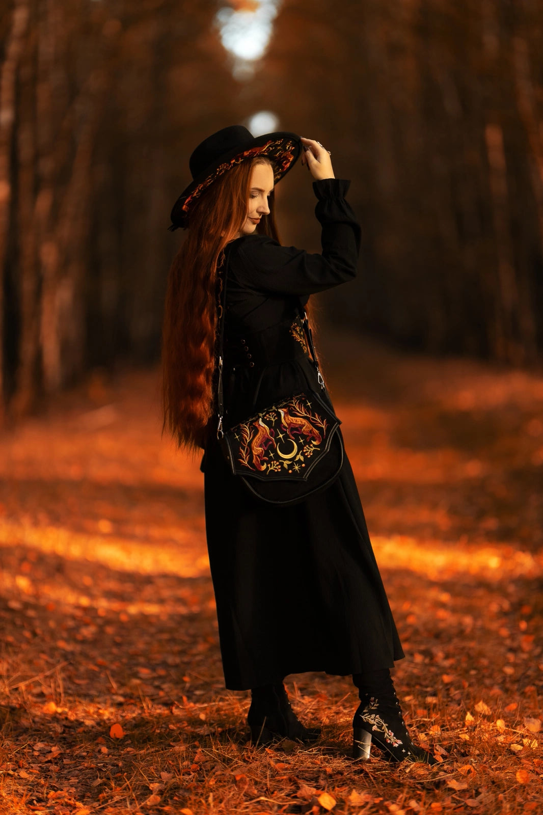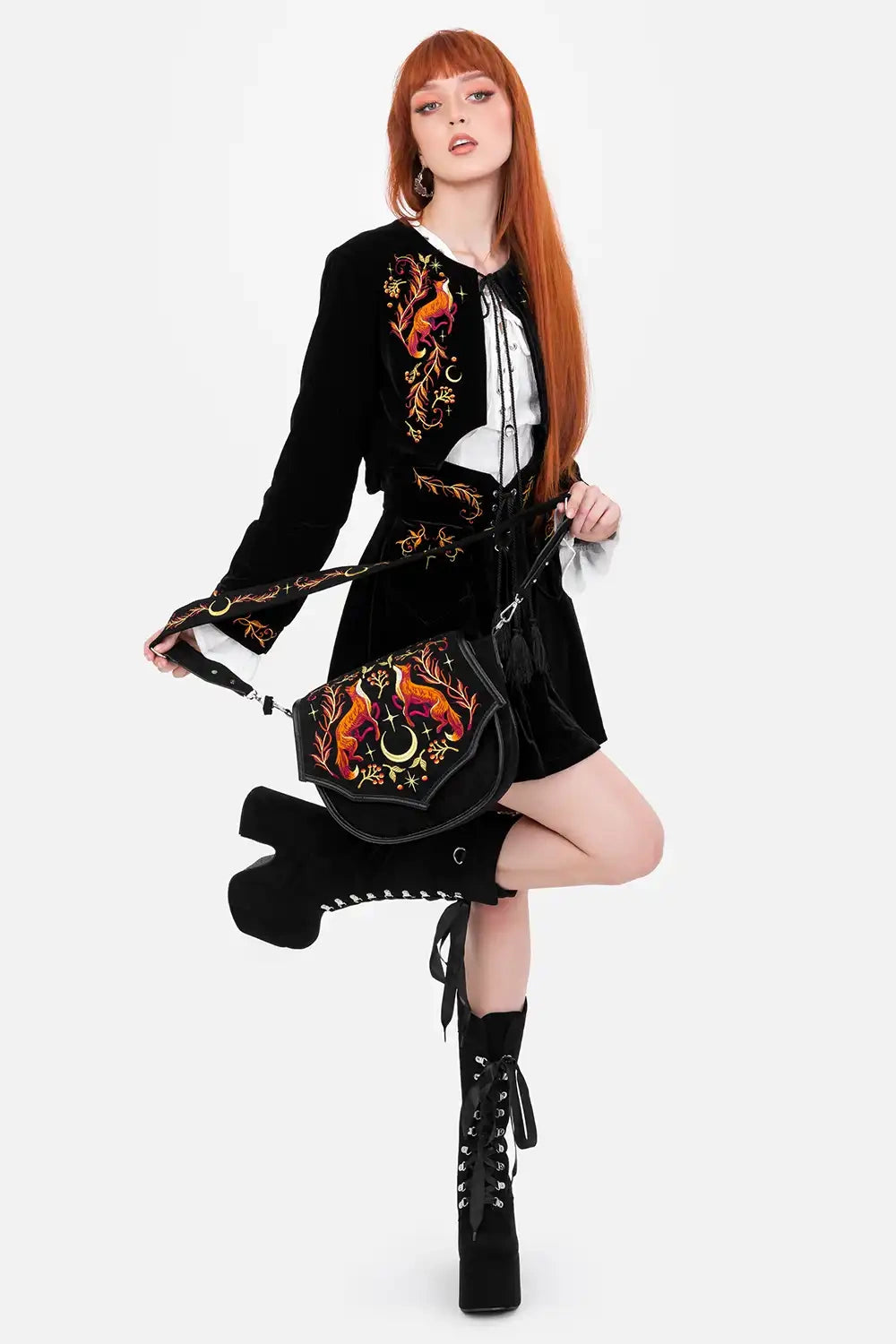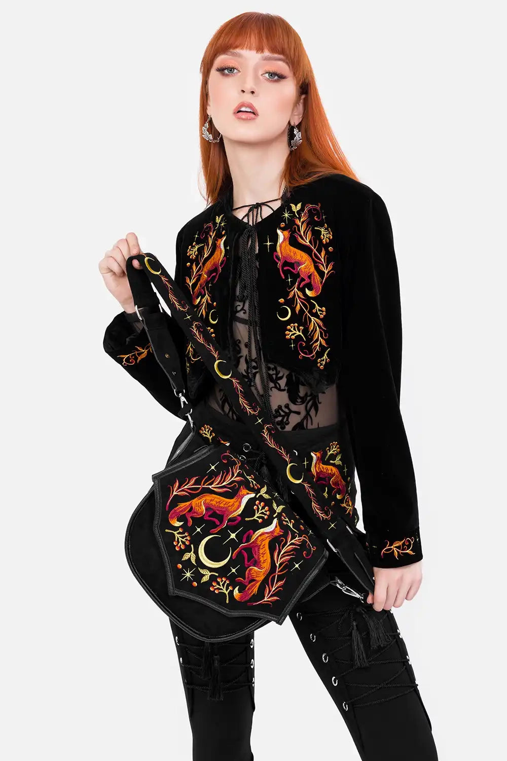 A fierce and enchanting fox bag for lovers of dark whimsy, witchy fashion, and forestcore style. The black faux suede bag is adorned with fiery red fox embroidery, glowing like embers in the night. Inspired by dark fairytales and forest magic, this nature-inspired bag blends boho mystique with gothic elegance, making it perfect for modern witches, wild souls, and moonlit wanderers.