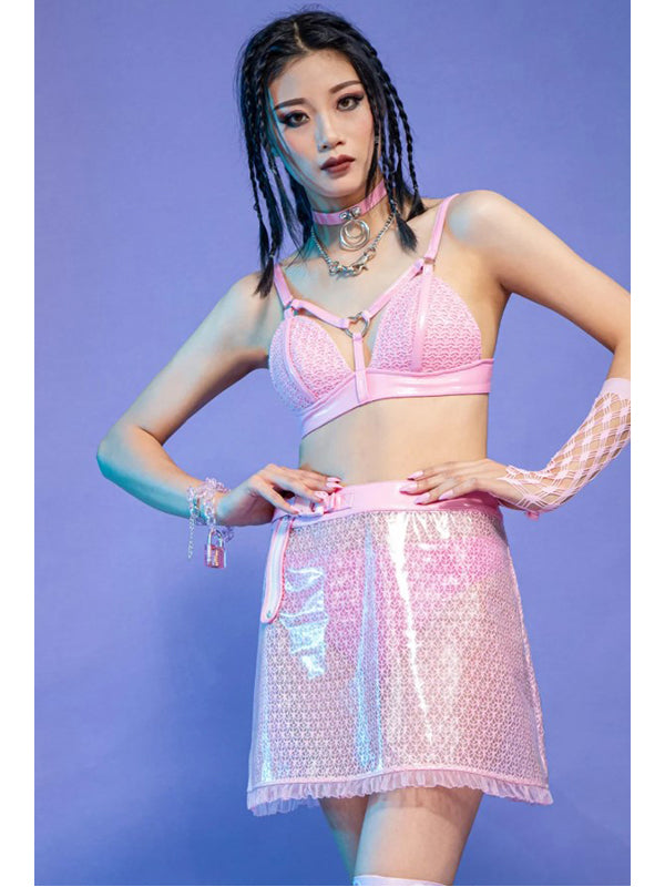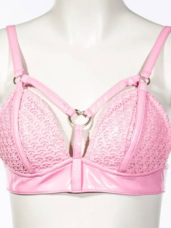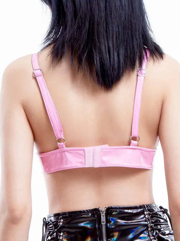 Bubblegum Vinyl Crop Top With Adjustable Straps & Metal Heart Accents - S - Op voorraad is in bestelling en wordt verzonden zodra het weer op voorraad is