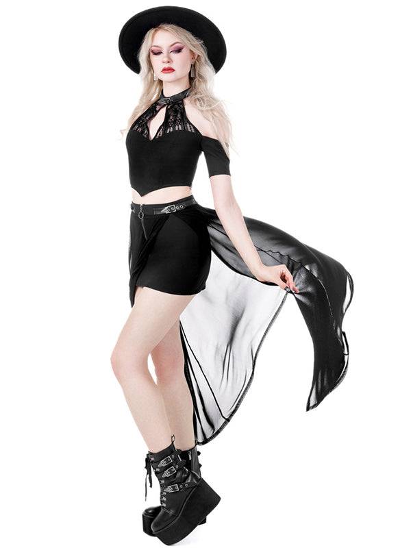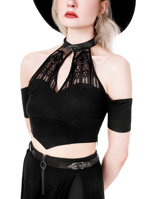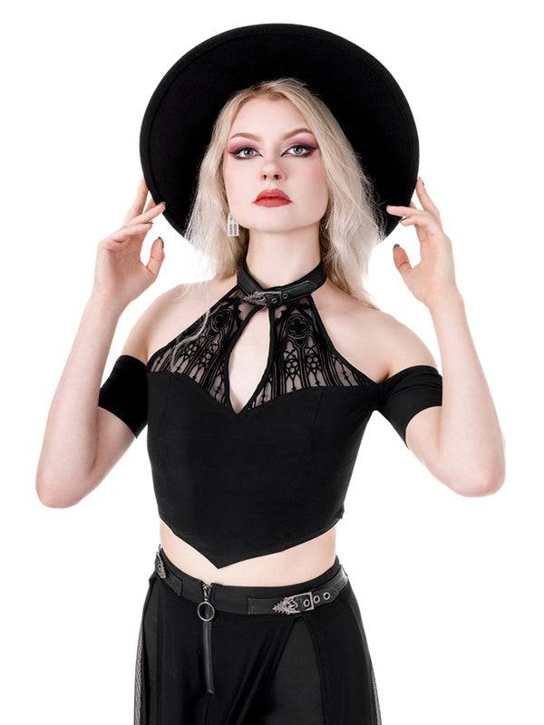Halternek-ontwerp. Kraag met contrasterend PU-leer en op maat gemaakte zilveren kathedraalgesp. Meshpanelen met 'Cathedral Window'-ontwerp. Getailleerde 3/4-mouwen. Verborgen ritssluiting aan de zijkant en verstelbare drukknoopsluiting middenachter in de kraag. Zachte, elastische viscose-katoenen stof voor comfort en flexibiliteit. 55% viscose, 40% katoen, 5% elastaan Mesh: 90% nylon, 10% elastaan.
