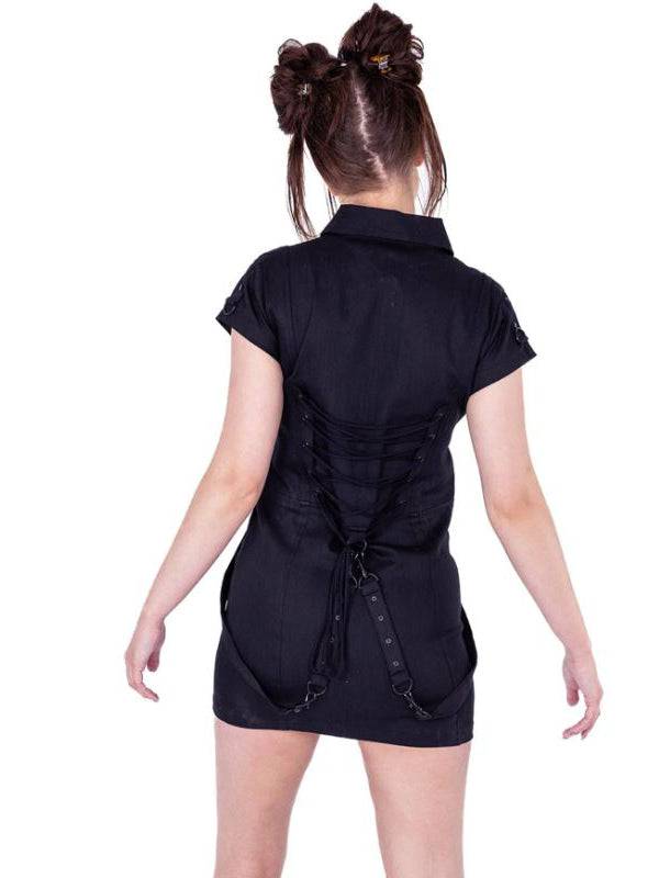 Emberlyn Black Mini Dress with Front Zip, D-Rings, and Lace-Up Back Design