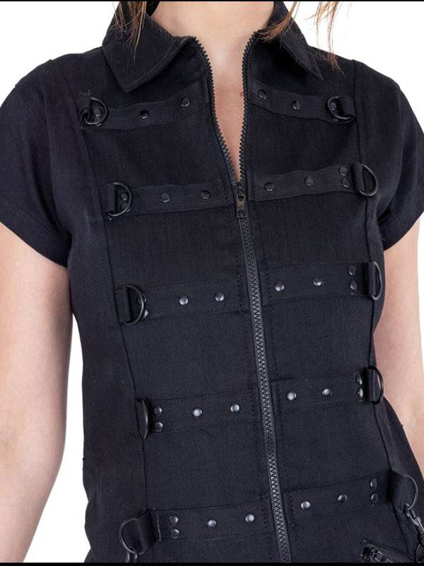Korte zwarte jurk met ritssluiting aan de voorkant, D-ringen, bandjes en veters aan de achterkant. 58% katoen, 39% Polyester, 3% Elastaan.