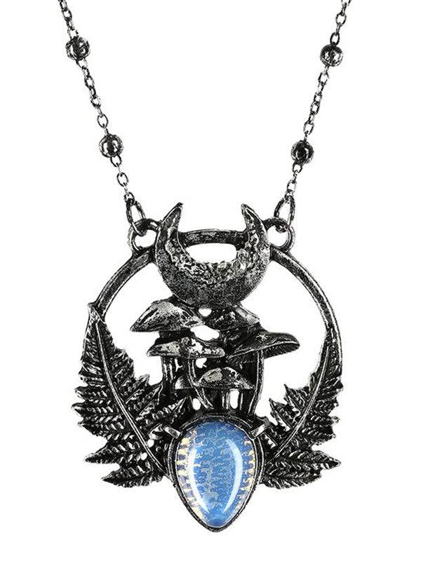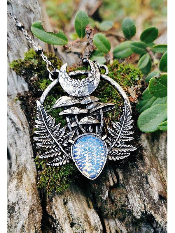 Unique Magic Forest Necklace with Opal Moonstone and Mushrooms - 5.5cm Hanging Pendant
