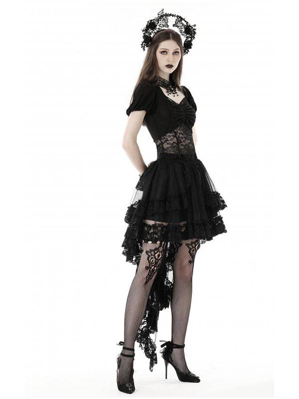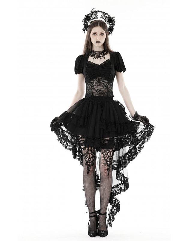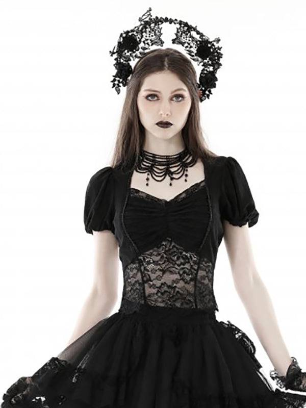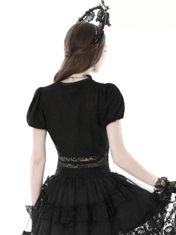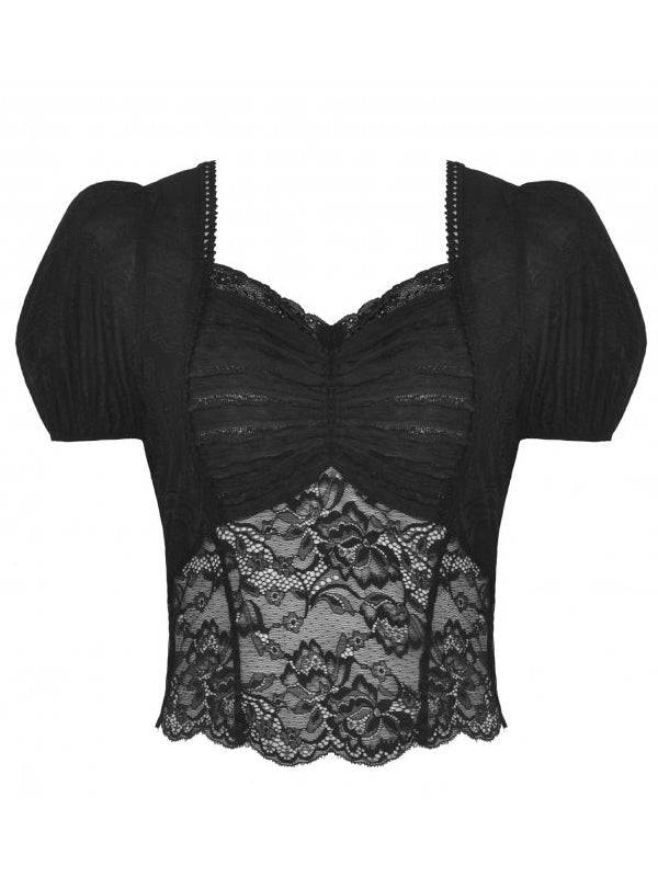 Black Lace Top With Short Puff Sleeves And Pleated Bust Design by Dark In Love
