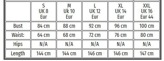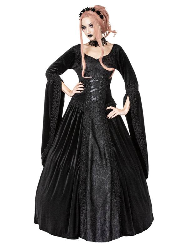 Zwart fluwelen middeleeuwse lange gothic jurk. De voorkant is gemaakt van zijdezacht satijn met een overlay van Venetiaans kant. Het is aan weerszijden afgezet met zwart brokaten kant. De mouwen zijn gevoerd met zijdezacht satijn met een overlay van Venetiaans kant. Verborgen ritssluiting aan de achterkant.