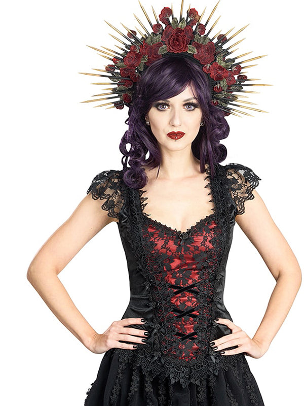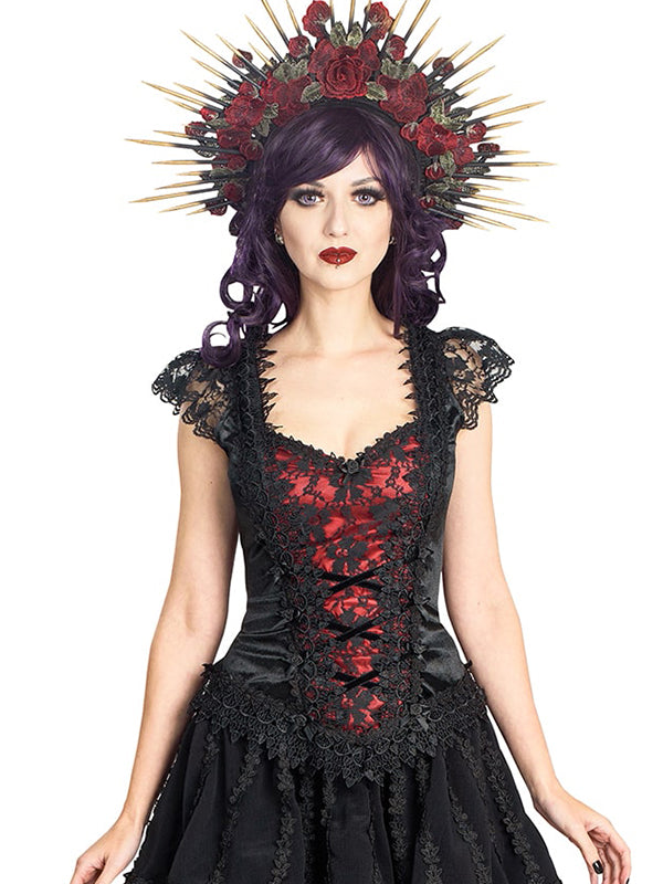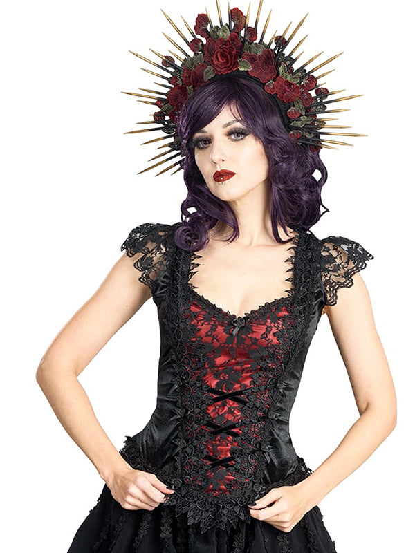 Fluwelen top met elegante, licht gegolfde, doorschijnende kapmouwtjes van Frans kant. Het voorpaneel is gemaakt van satijn met Franse kanten overlay en heeft een prachtig gekruist fluwelen lintapplicatie in het midden. Versierd met zwarte satijnen strikken en rozen. Lieve halslijn. Ritssluiting aan de achterkant van de top.