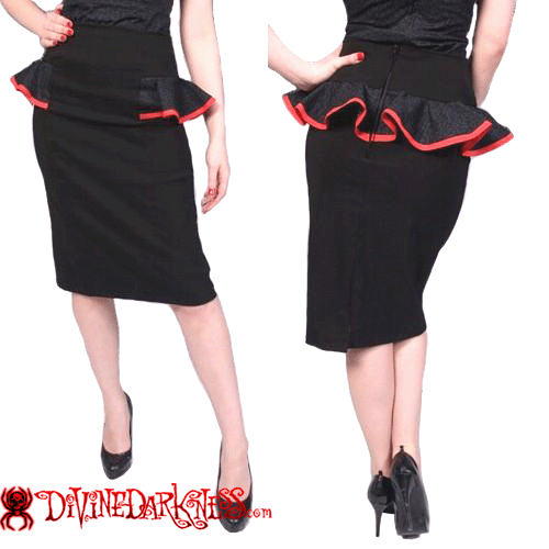 Zwarte stretch vintage rok van katoen, Ruche met zwarte luipaard accenten en rode bies.