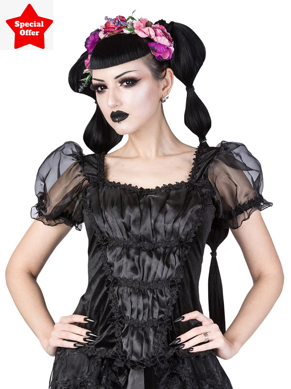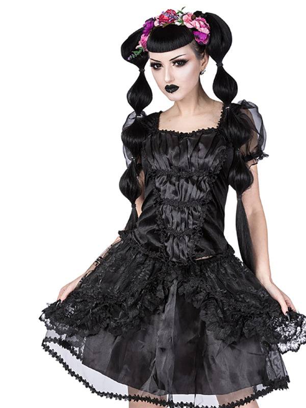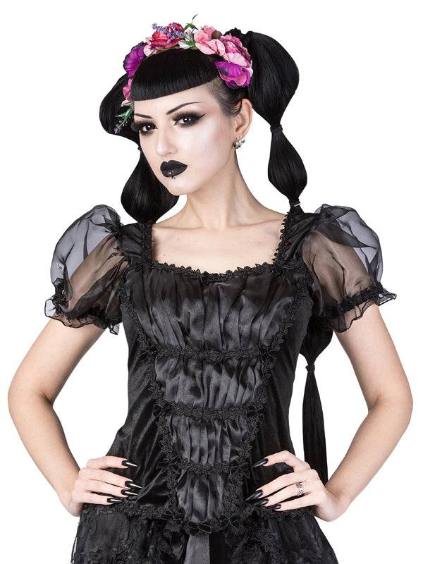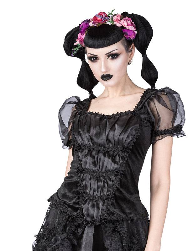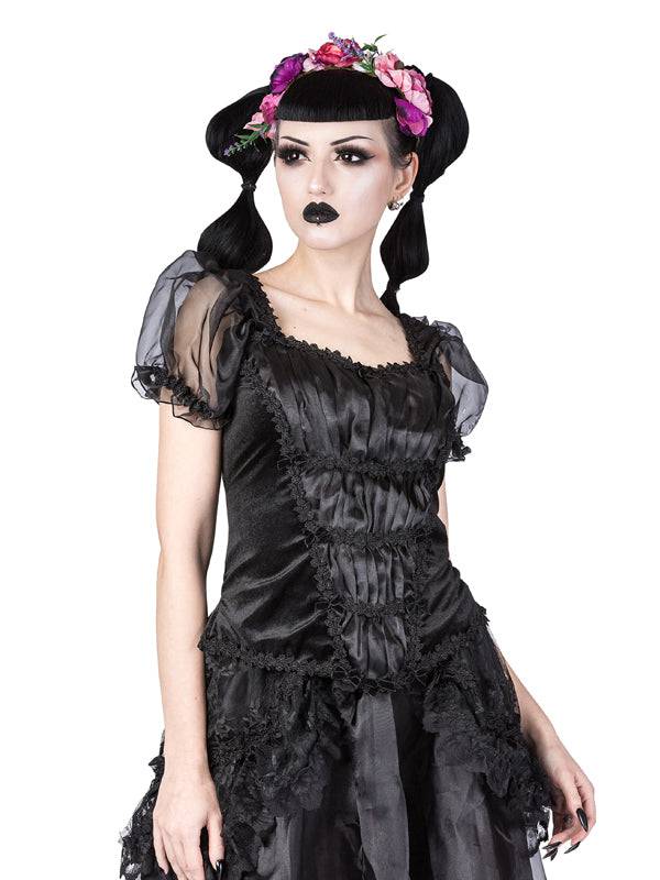 Black Velvet Top With Diamond Neckline And Organza Puff Sleeves - Sinister Clothing