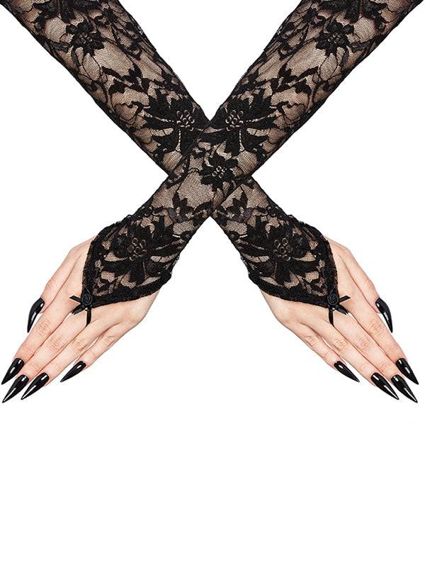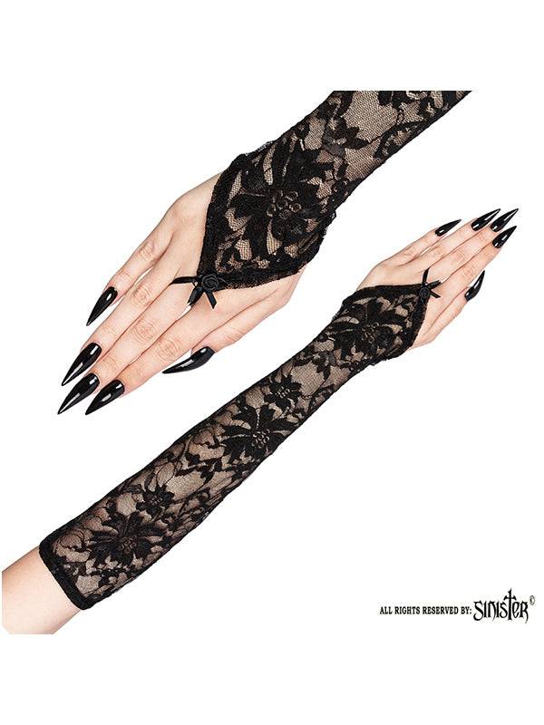 Sinister. Lange zwarte gebloemde kanten handschoenen gedetailleerd met een kleine zwarte satijnen roos over de vingerlus. Deze handschoenen hebben een satijnen lint vingerlus.