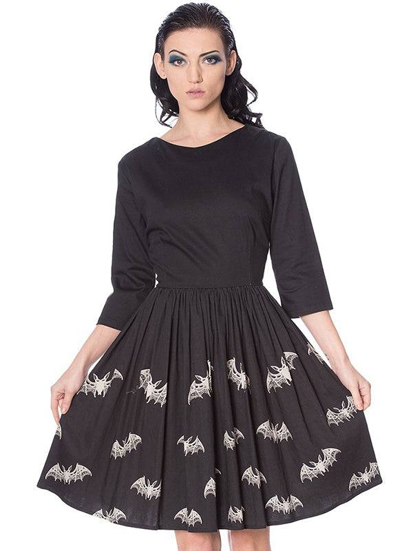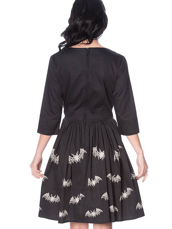 Banned 3/4 Sleeve Bat Print Dress with Back Zip - Cotton and Elastane Blend - S - Op voorraad ist auf Lager und wird versandt, sobald es wieder verfügbar ist
