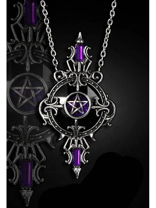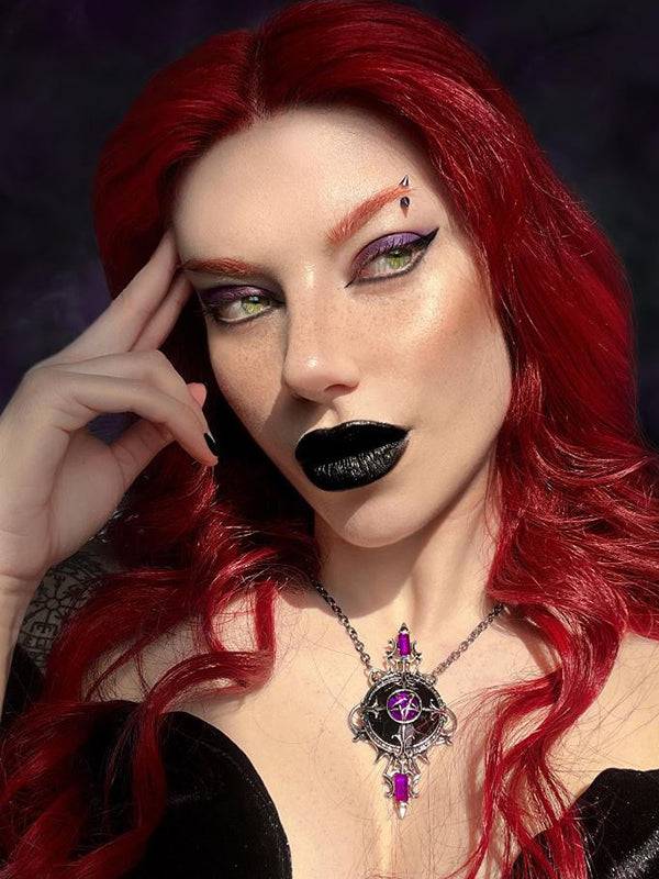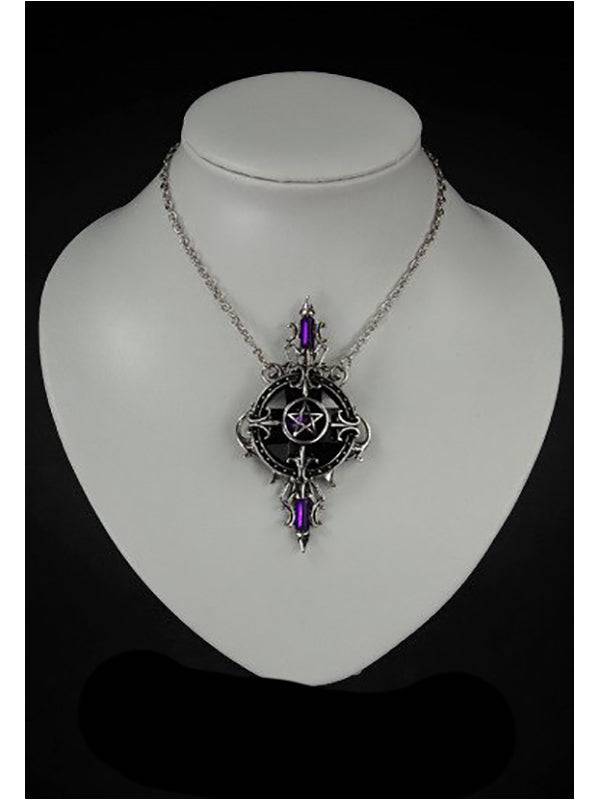 Ketting is gemaakt van duurzaam metaal in de kleur antiek zilver (tin). Zwarte gefacetteerde steen, omgeven door een decoratief frame. Stijl versierd met paarse edelstenen en een klein pentagram. Sieraden gemaakt van zinklegering.
