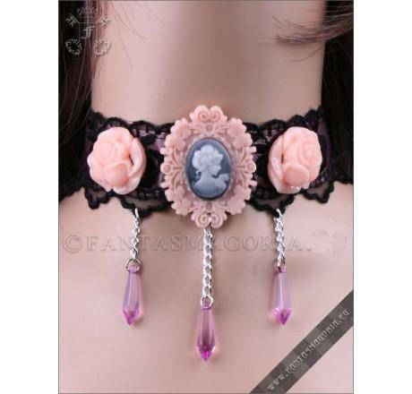 Zwarte kanten choker versierd met roze rozen, een camee en roze druppelvormige kralen. Handgemaakt