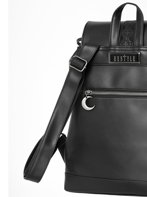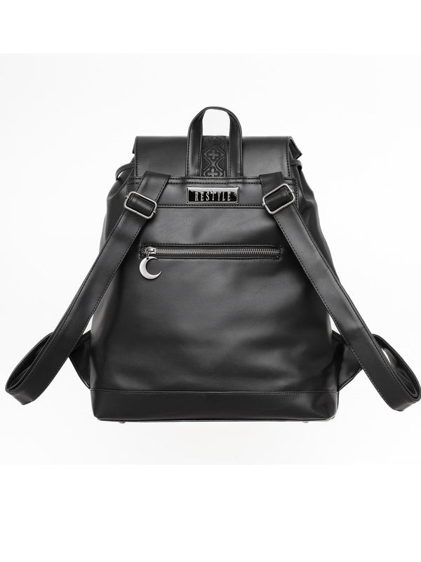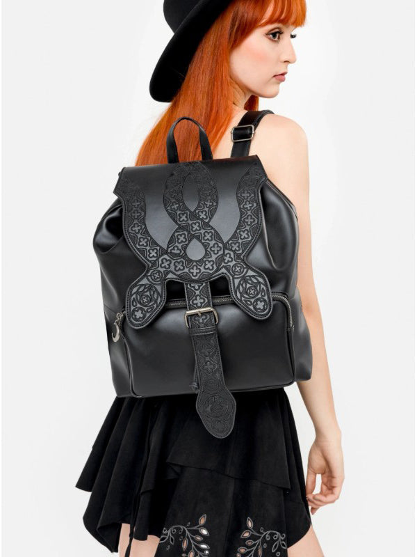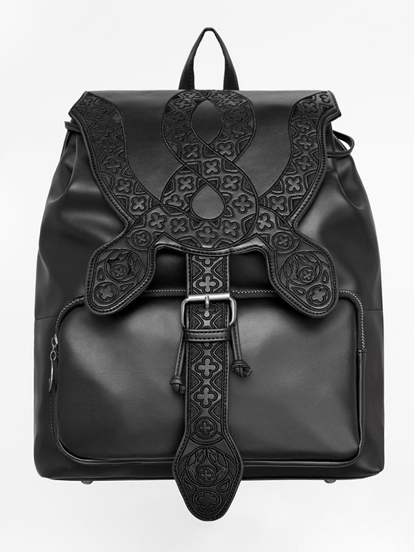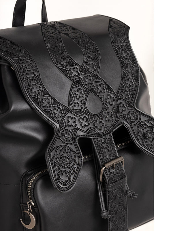 Deze gothic PU-leren rugzak toont ingewikkeld geborduurde slangen, hun golvende lichamen versierd met patronen geïnspireerd op de kathedraalarchitectuur.