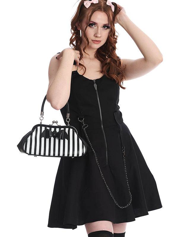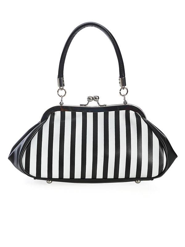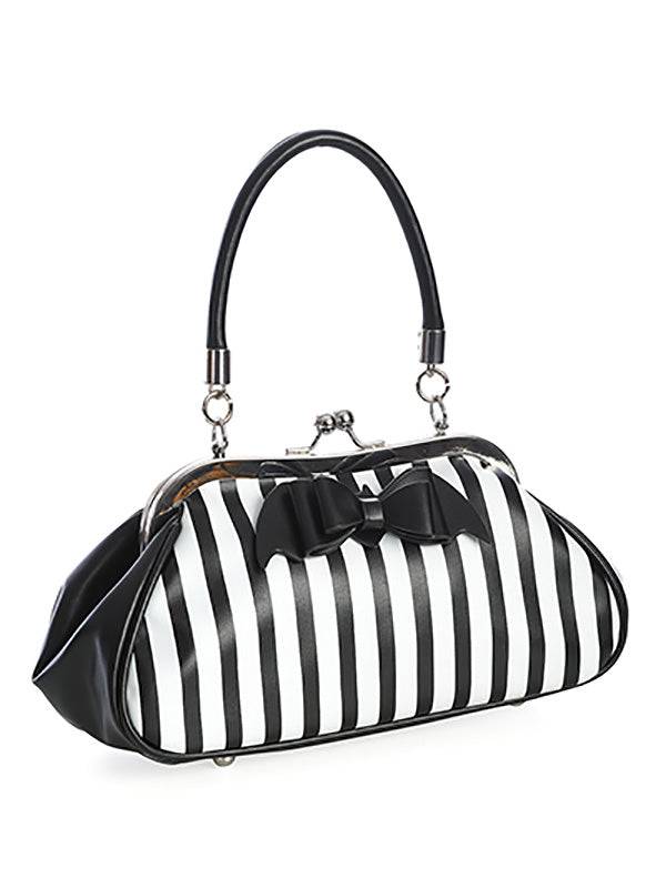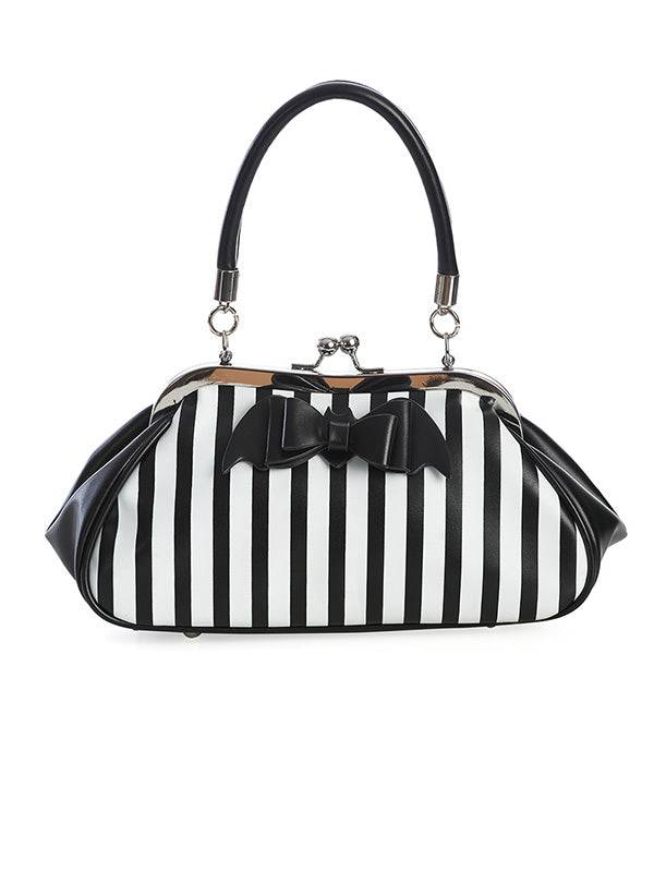 Wit-Zwart gestreept handtas met kleine zwarte strik in de vorm van vleermuis. Hoogwaardige kunstleer. Afneembare en verstelbare schouderriem. Clipsluiting. Tussenvak met rits. Binnen extra ritsvak en steekvak. 29cm x 15cm x 12cm