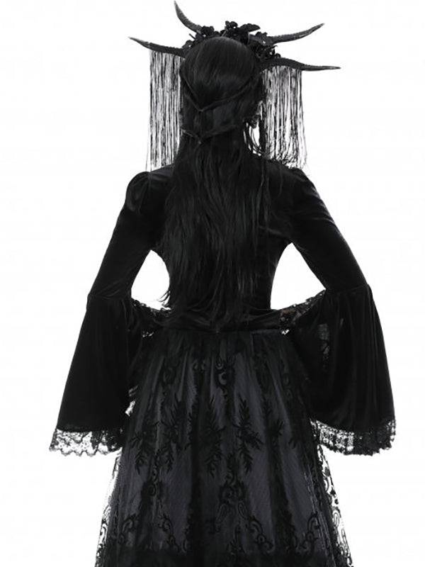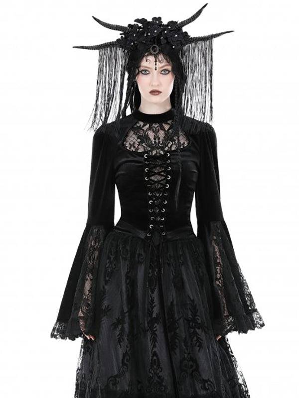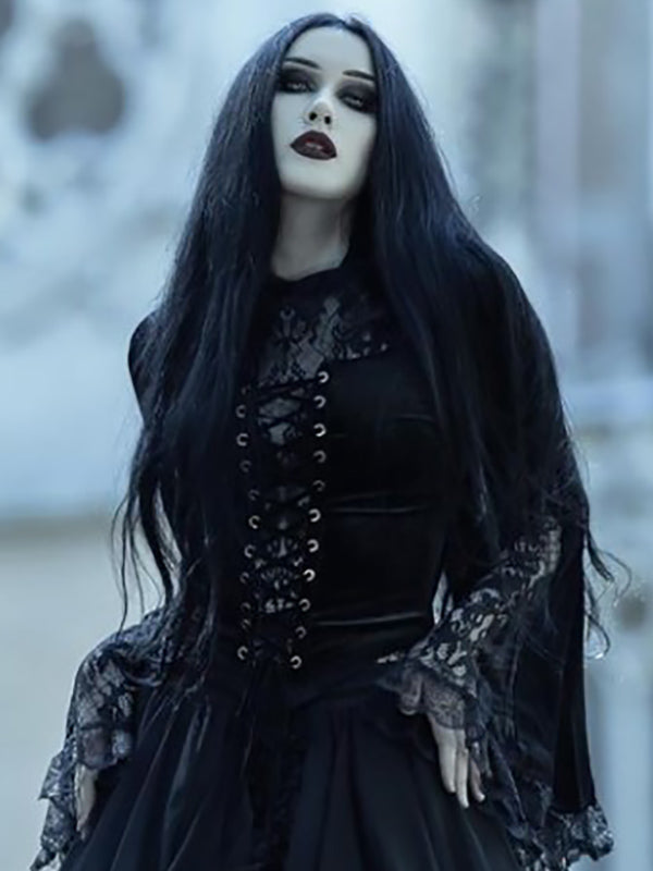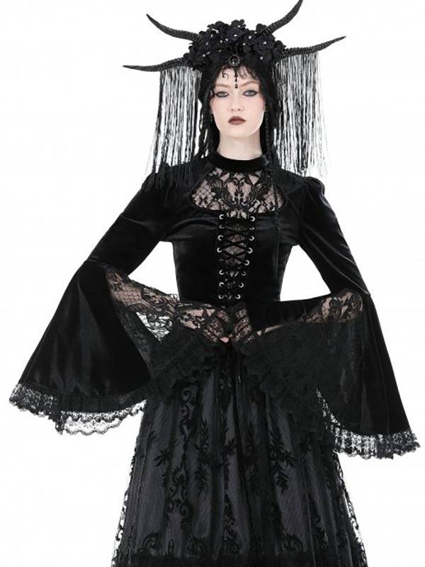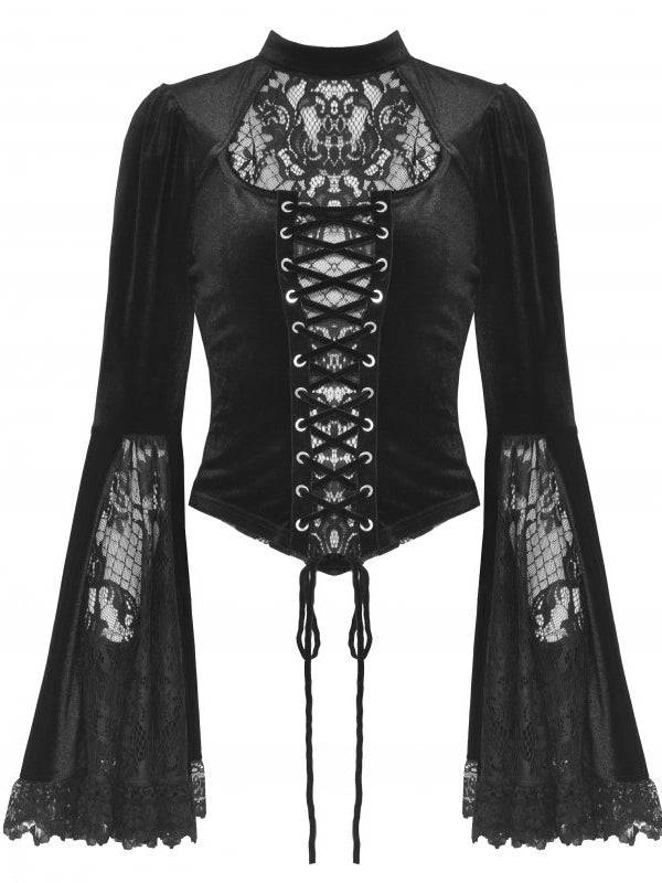 Dark In Love Black Velvet Sorceress Top with Lace Sleeves and Front Lacing for Women