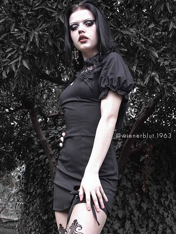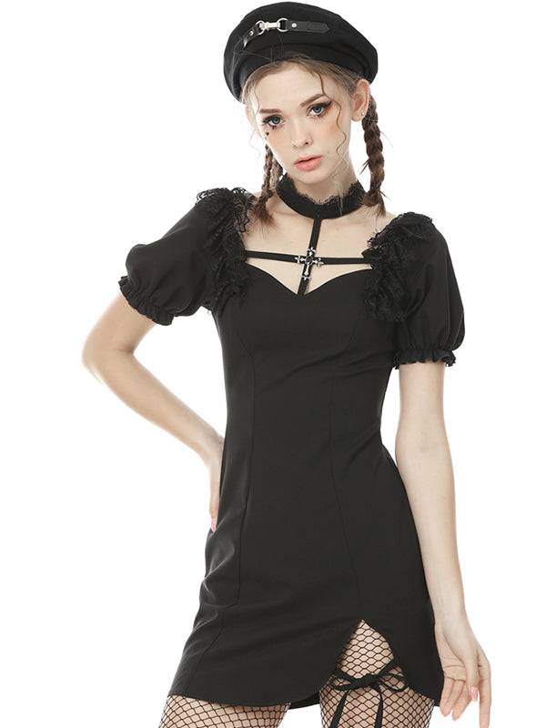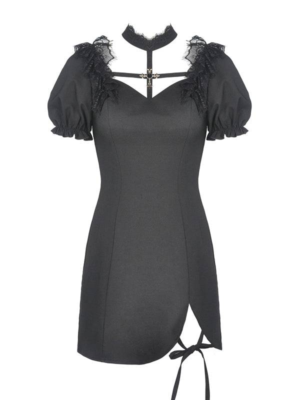 Short black dress with puff sleeves, choker with lace and cross.