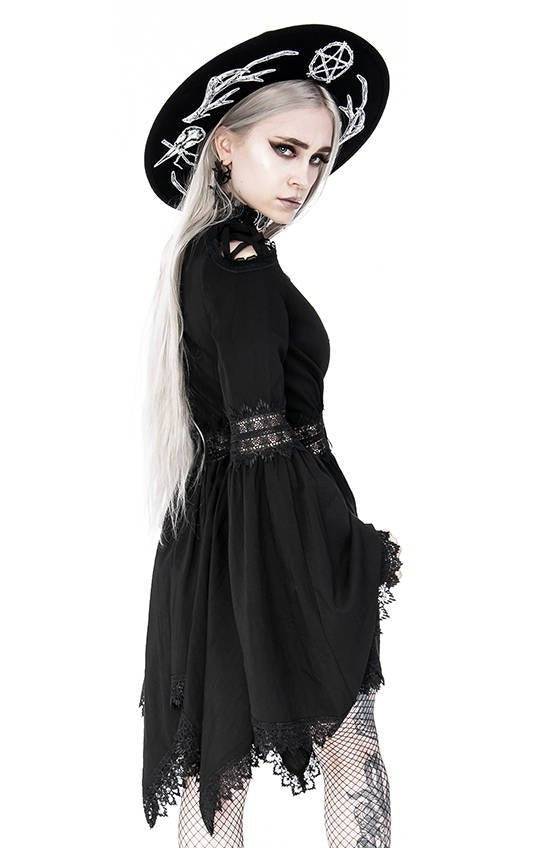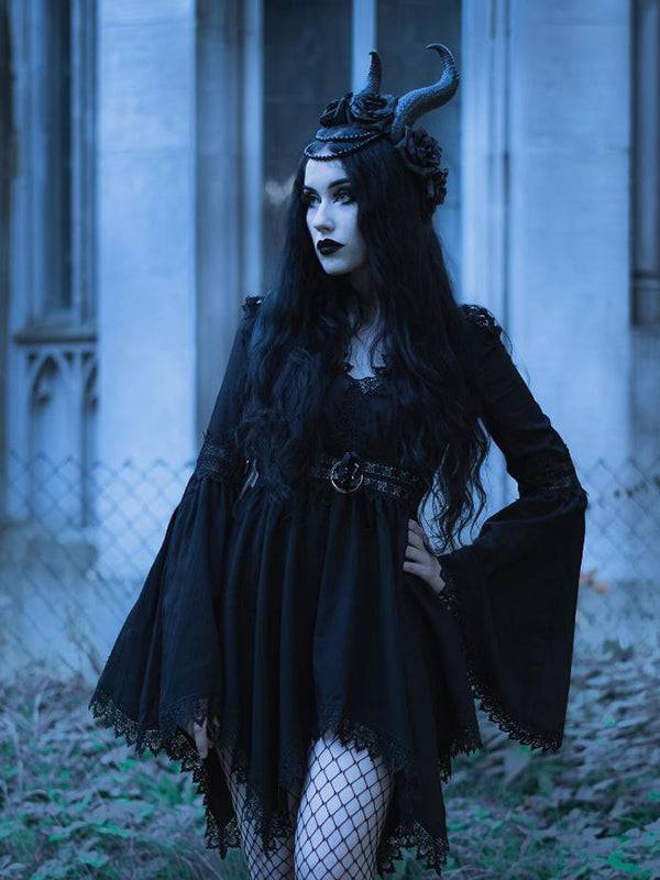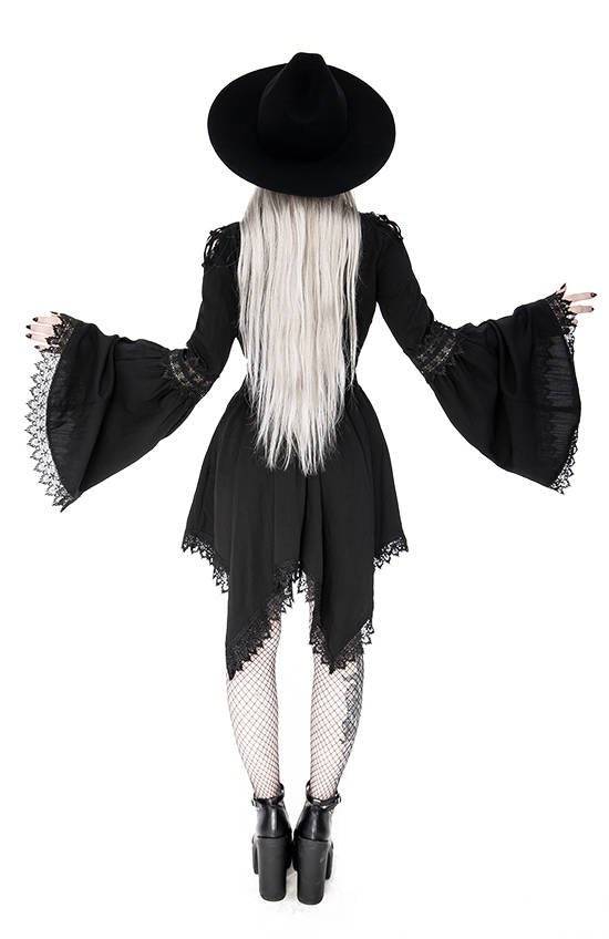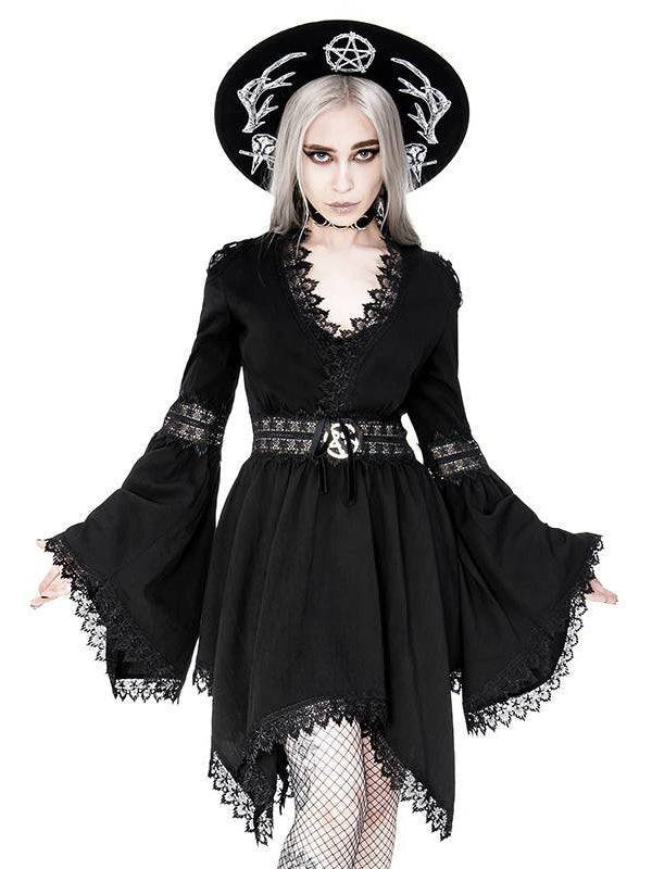 This dress has a deep V-neck trimmed with delicate guipure and finished with a pentagram insert. The shoulders are cut out and also trimmed with guipure, and inside of it, there are stripes arranged in the pentagram pattern. It has flared sleeves finished with Venetian lace. The tunic has a cut-off under the bust, which emphasizes the waist and at the same time provides an airy hem with elongated sides.