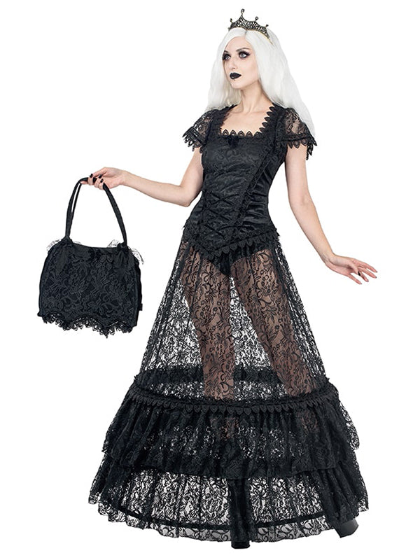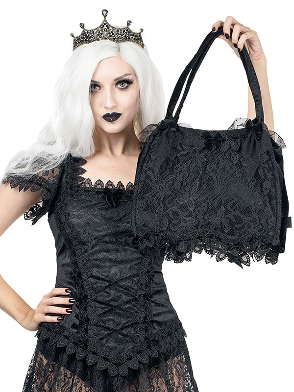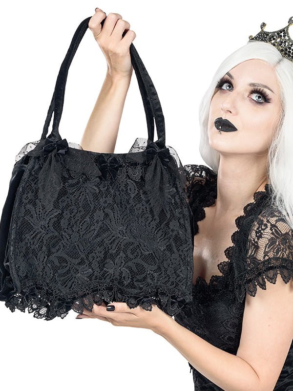 Black velvet handbag with Sicilian lace overlay at the front. The bag is adorned with velvet ribbon lacing trough brocade lace trimming and is decorated with velvet bows.
