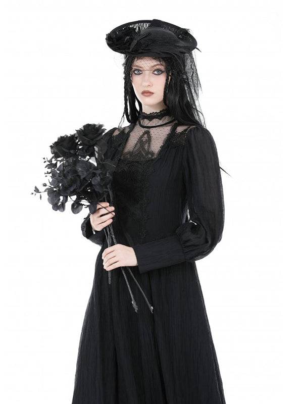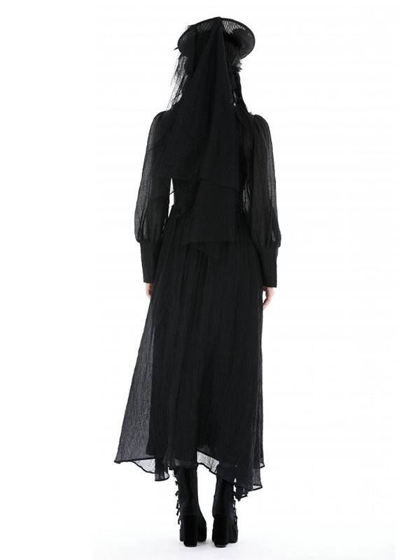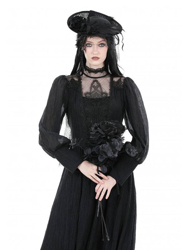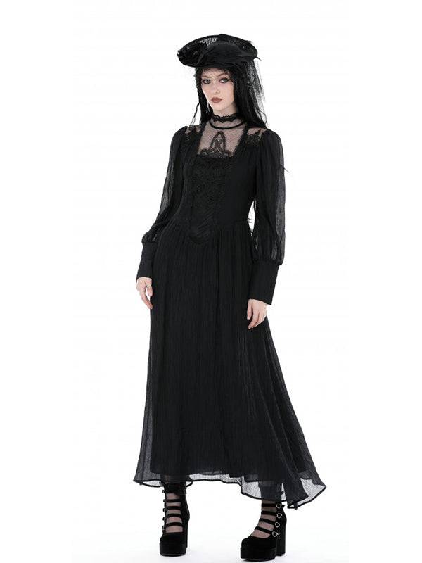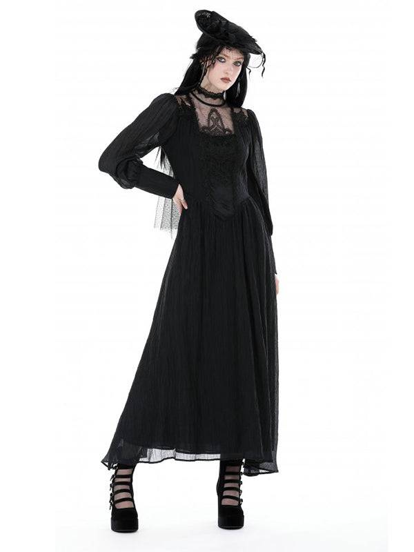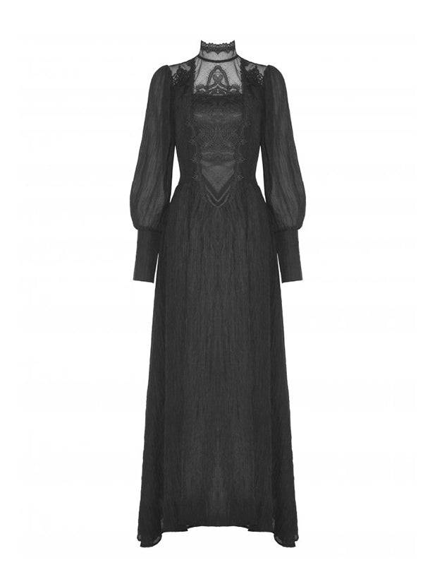Long romantic gothic dress with very detailed neckline and high collar. Long puff sleeves. Zipper at the back.