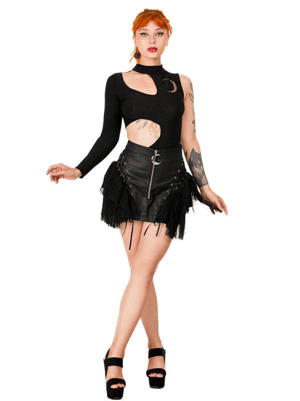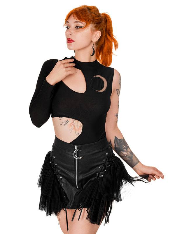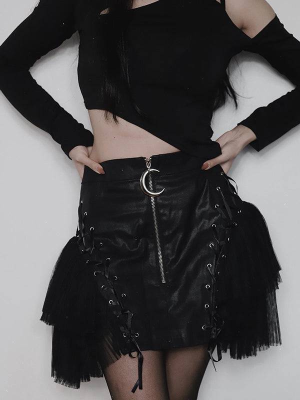 Adorned with corset-style lacing and a crescent moon motif zipper, the ensemble exudes a unique charm. The skirt is mini in length, encapsulating the spirit of the 80s.