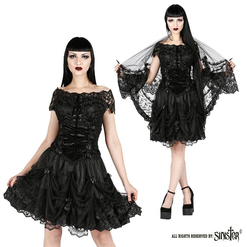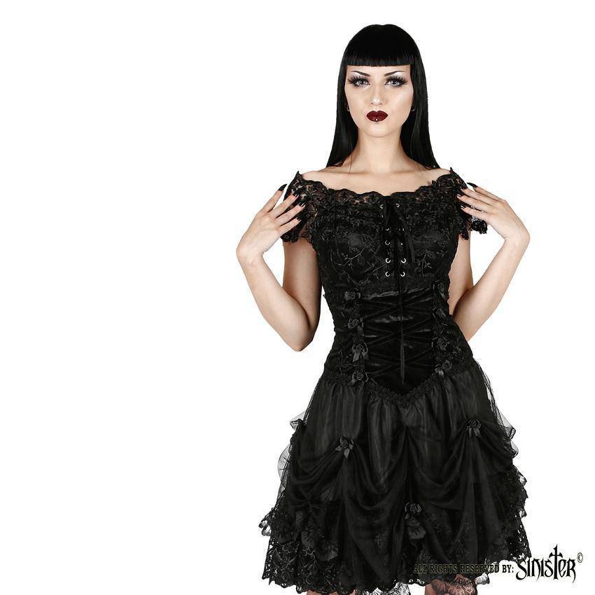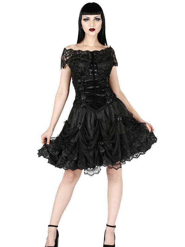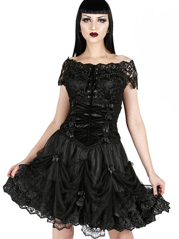 Off-shoulder minidress with an embroidered lace bateau neckline. At the centre front of the bust is velvet ribbon lacing up. The sidepanels of the waist are overlaid with embroidered lace and trimmed with brocade. Centre back zip fastening.