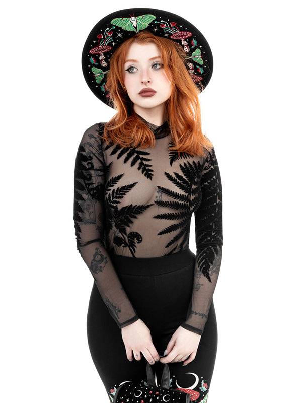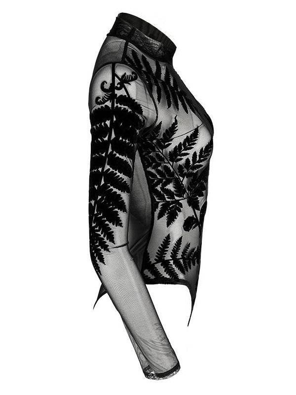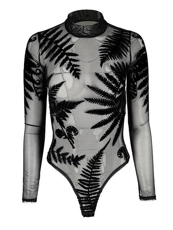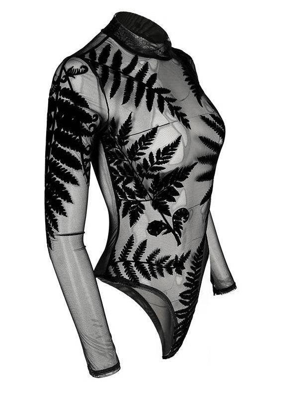 Bodysuit with long sleeves and turtleneck entirely made of mesh. The material adapts to the shape of the figure and is stretchy at the same time. Fastened only at the bottom, with two convenient snaps. The print is soft, it feels like velvet. Made using the flocking method, thanks to which it is durable and has a deep black color.