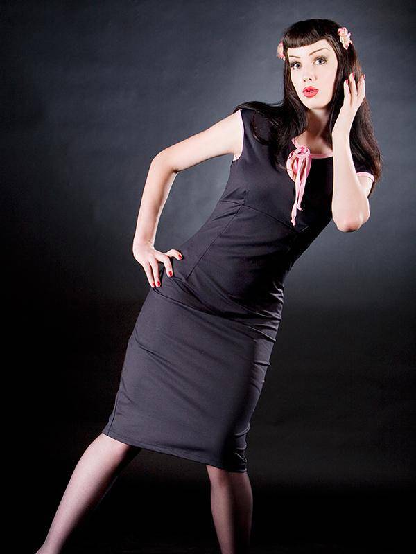 Stretchy cotton pin up dress from "Heartbreaker". Black dress with pink trims