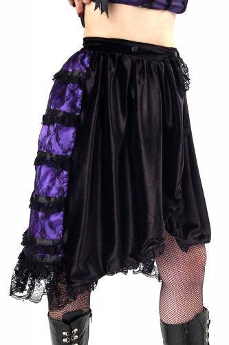 Black velvet and purple satin skirt decorated with lace and frills at the back. Snap fasteners at the front.