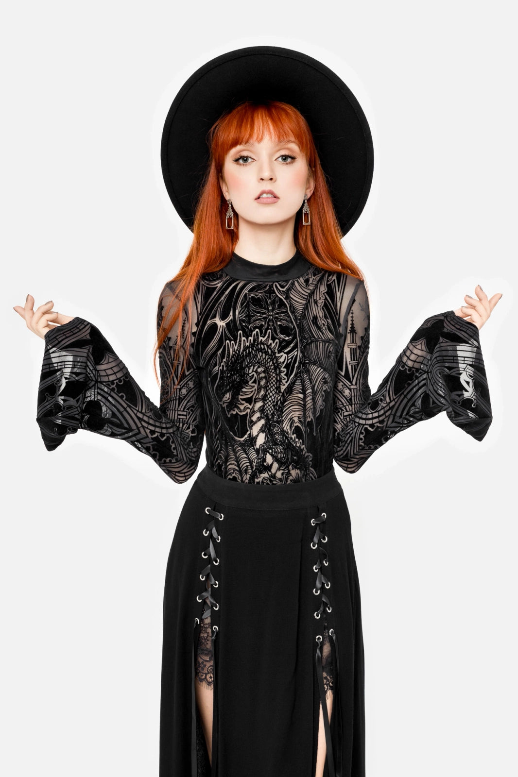 Where myth meets architecture – this gothic mesh bodysuit features a powerful dragon rising above cathedral spires, inspired by medieval legends and the haunting beauty of stained glass and tracery.