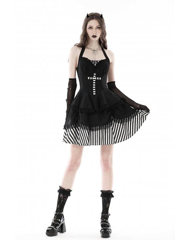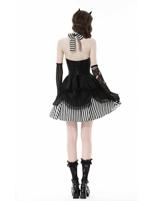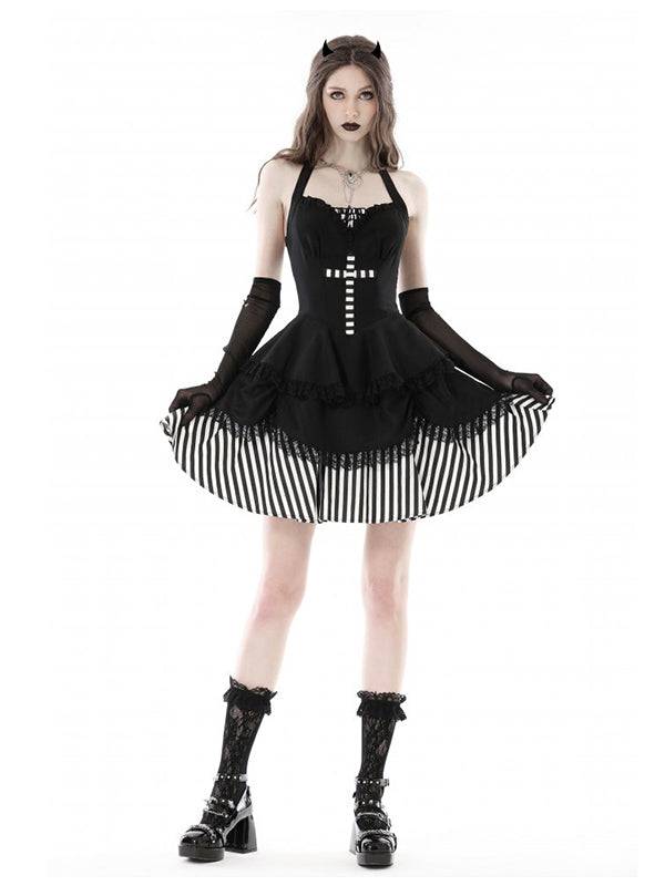 Halter dress with black and white stripes, cross, lacing at the back and bow behind the neck.