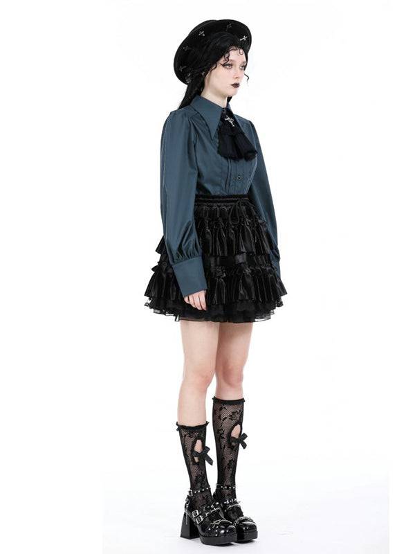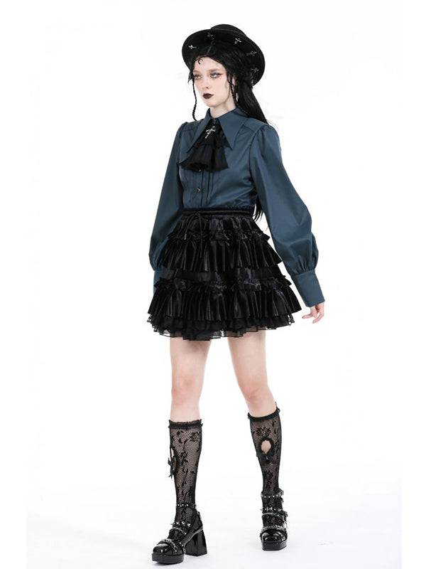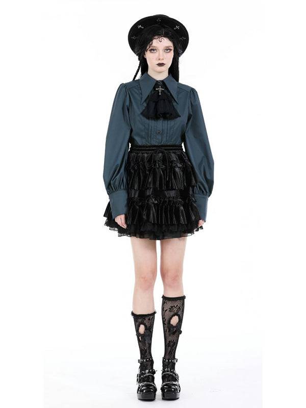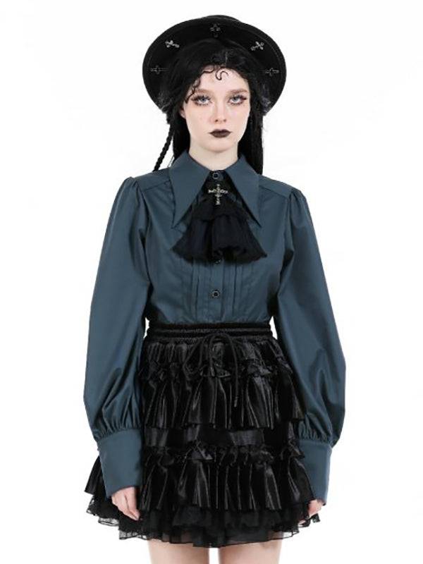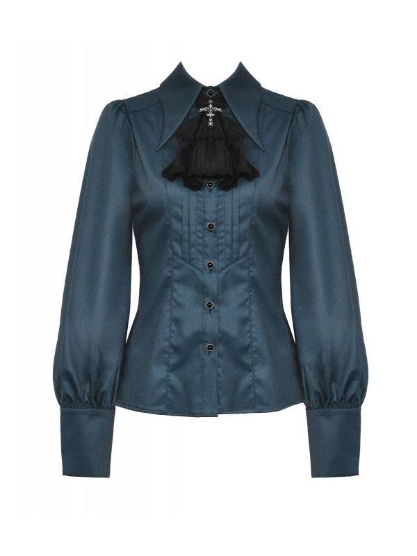 Blouse 77% polyester, 20% model and 3% spandex with pointed collar with detachable jabot. Long puff sleeves. Button front.