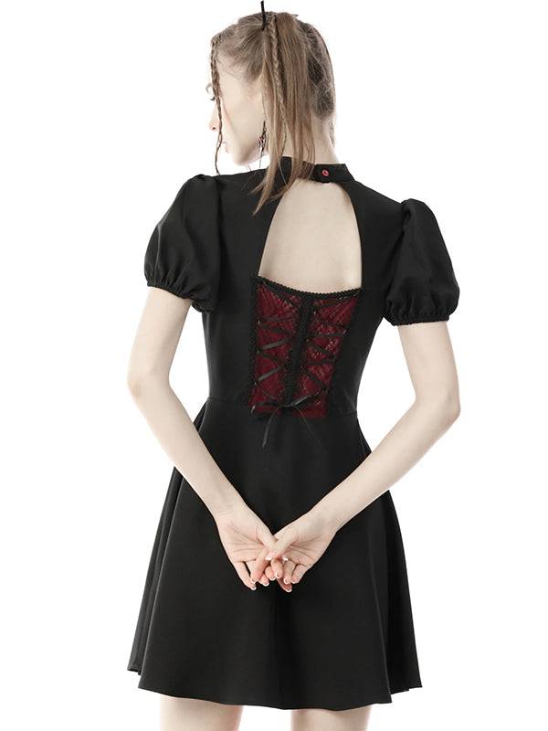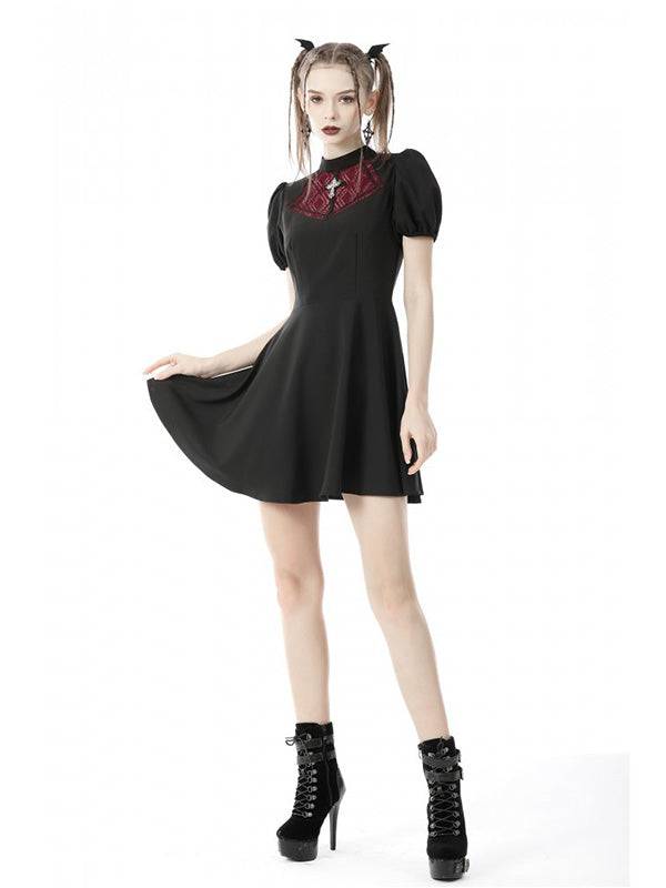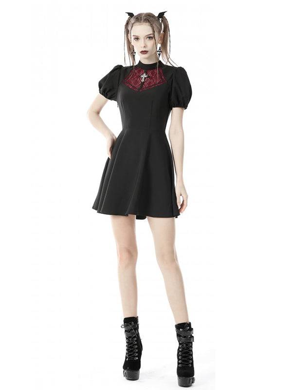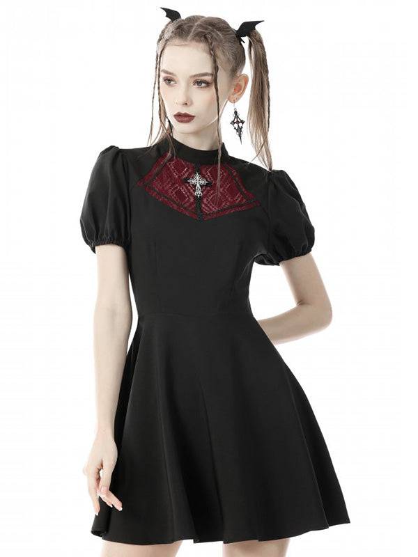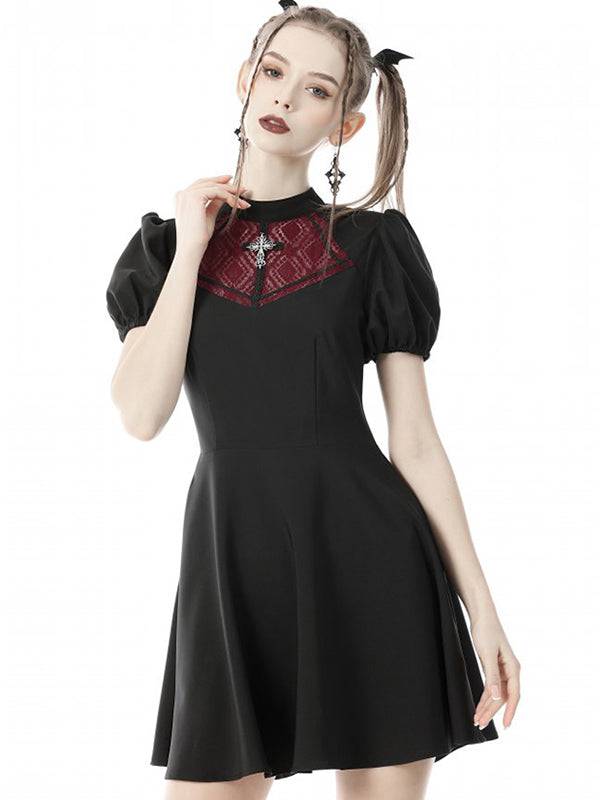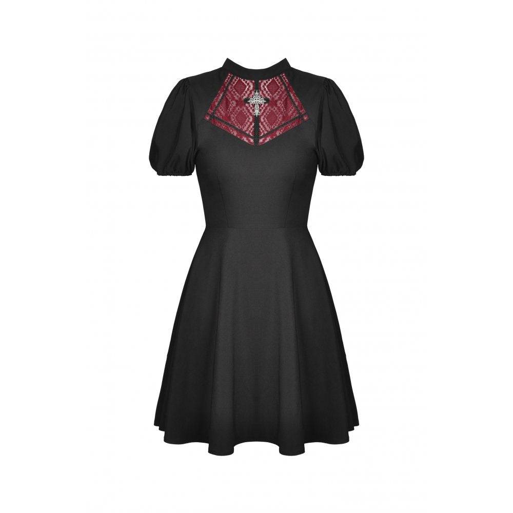 Delicate, little black dress. Cute top with high collar, neck button, and puffy sleeves with elastic cuffs. Blood red lace contrast with black border trims and gothic metal cross.