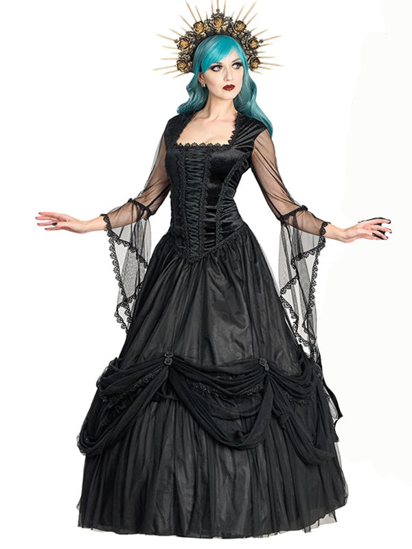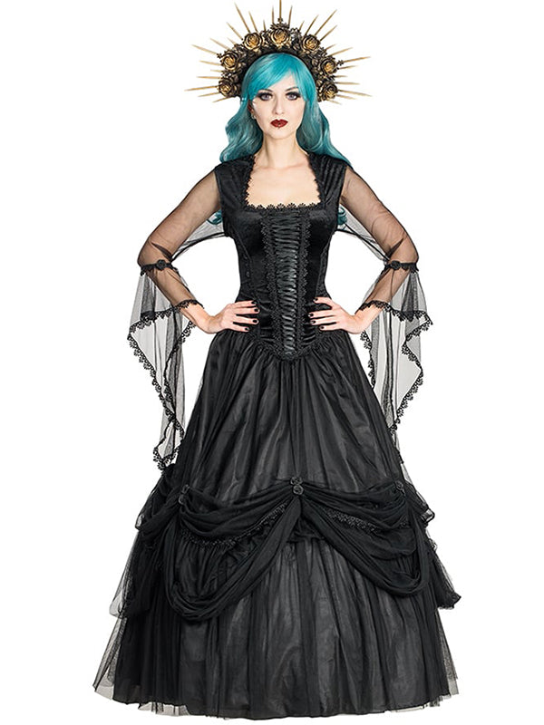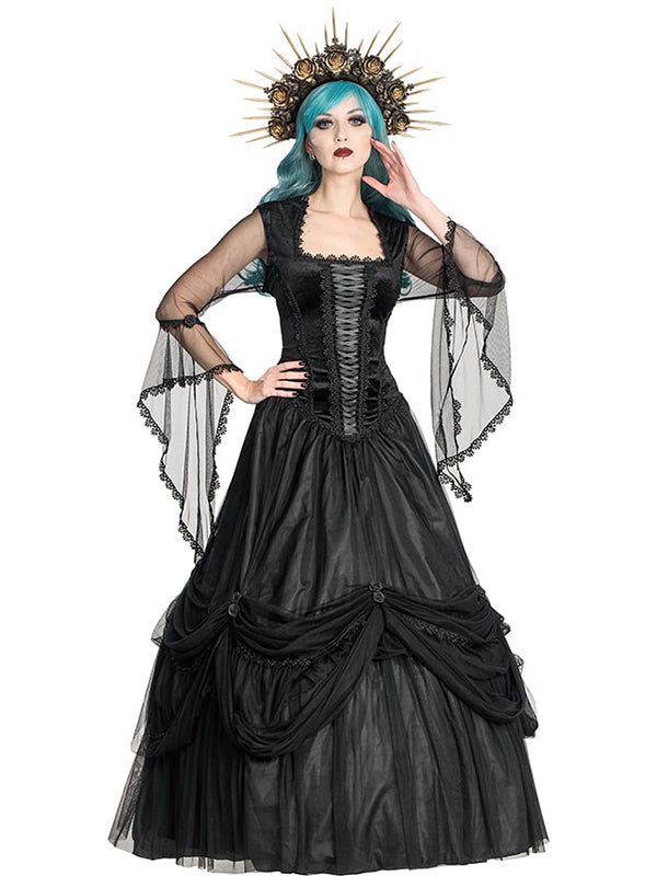 Gothic Victorian gown with square neckline and graceful, transparent black mesh sleeves decorated with lace. The black velvet top is crafted with a corset-inspired design, featuring delicate lace-up details at the center front for a flattering silhouette. The fully lined skirt is layered with rich black mesh drapery gathered by satin ribbon roses. Concealed zipper fastening at the back.