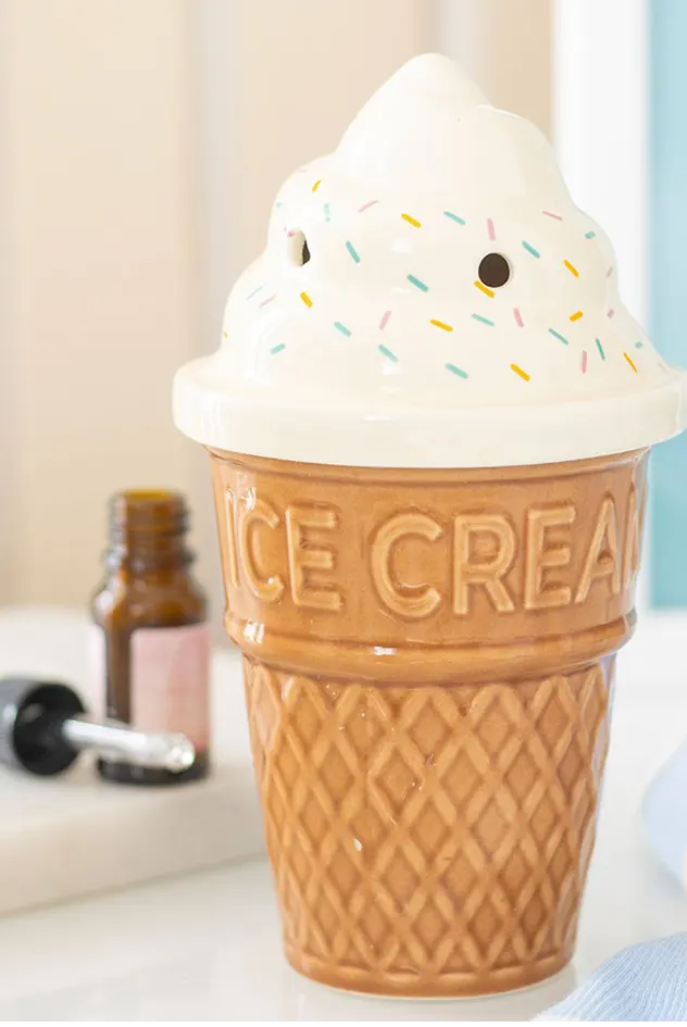 Sweeten your space with this ceramic oil burner shaped like a delicious ice cream cone, complete with a swirl-effect lid for extra charm. Ideal for use with fragrance oil diluted with water, this whimsical design is perfect for adding a fun seaside twist to any room. Do not use more than one tealight and remove lid when in use. Recommended for use with fragrance oil diluted with water. Never leave a lit candle unattended.