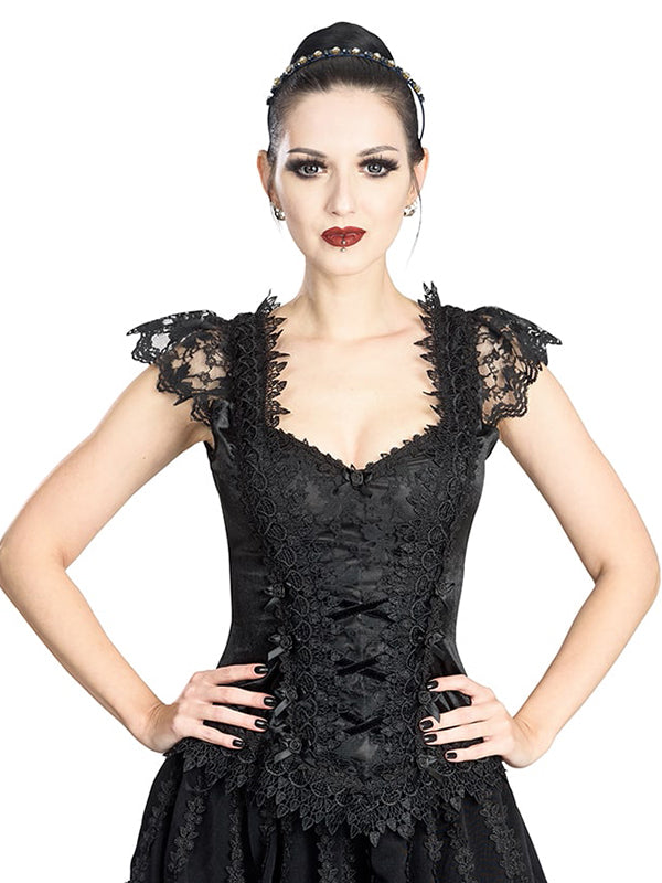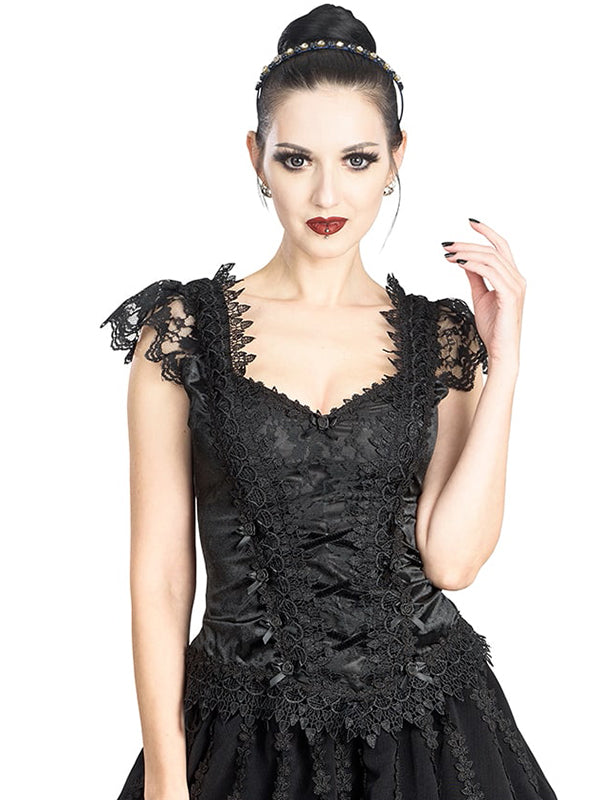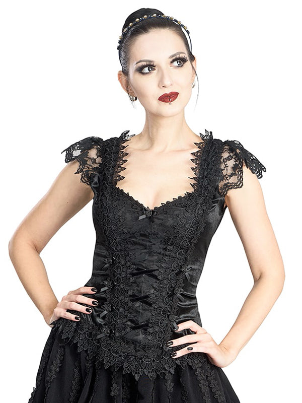 Velvet top with elegant slightly ruffled sheer French lace cap sleeves. The front panel is made of satin with intricate French lace overlay and has a beautiful crisscross velvet ribbon appliqué at the center. Decorated with black satin bows and roses. Sweetheart neckline. Zipper fastening at the back of the top.