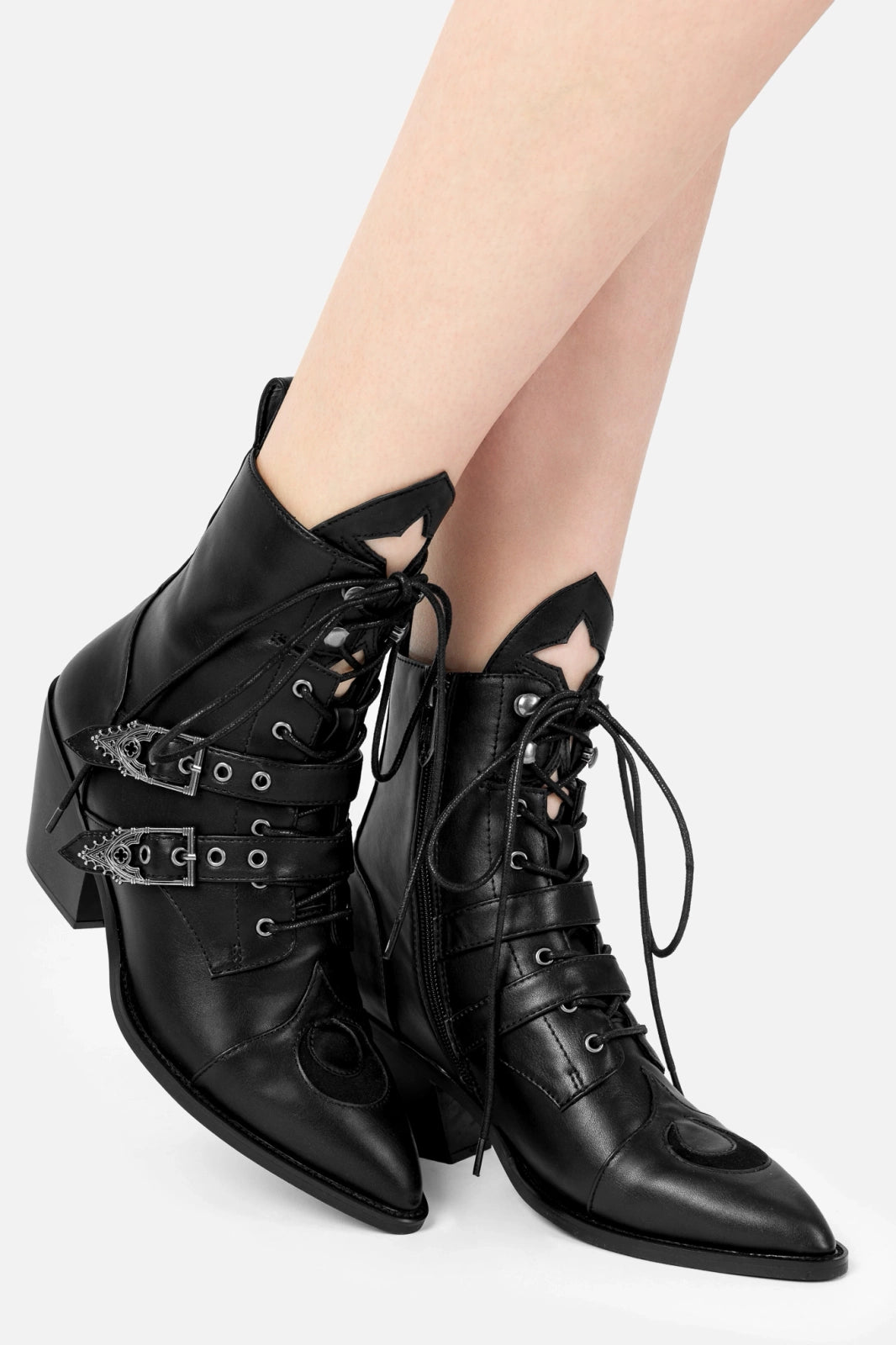 The Moonstruck Boots are gothic ankle boots with architectural detail and celestial flair. Made from sleek PU leather, they feature cathedral tracery cut-outs, crescent moon toes, and spire-style buckle straps. Built to be styled your way, they offer two distinct looks — lace them up fully for a classic silhouette, or wrap the laces at the ankle to reveal the pointed tongue and detailed cut-outs.
