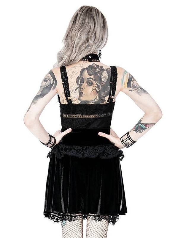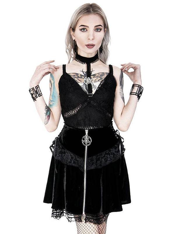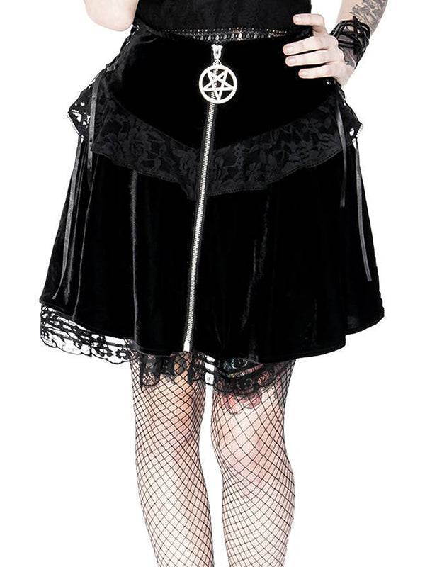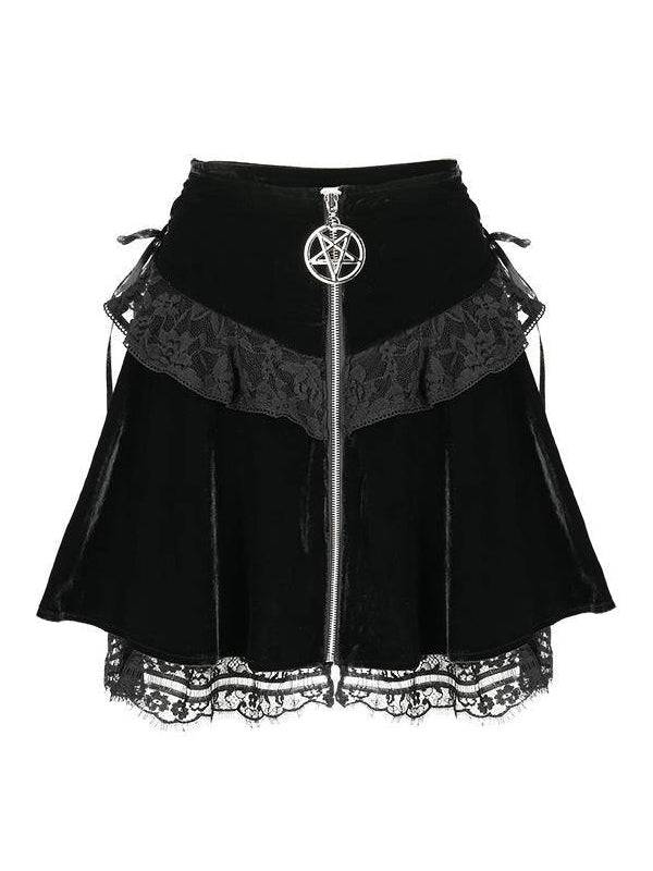 Skirt made of soft velvet and lace The skirt is fastened with a meter-long zipper with a pentagram pull. Lacings on the sides. The gothic skirt goes perfectly with lace and velvet tops. Velvet and lace (100% polyester).