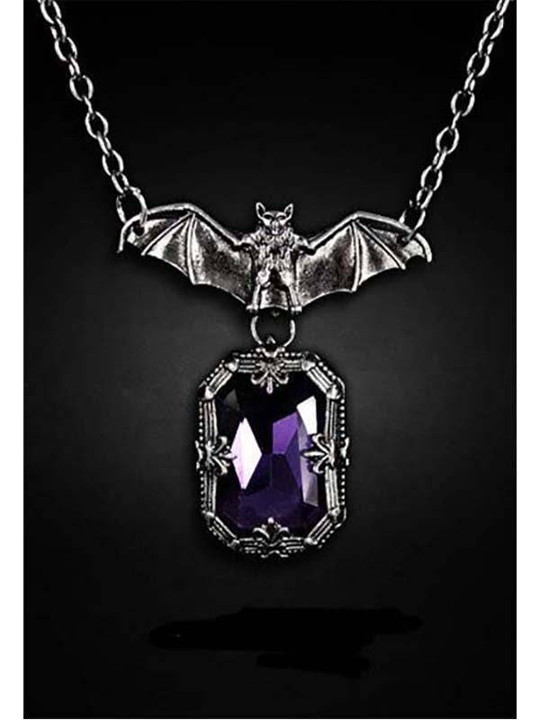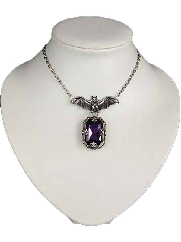 Subtle necklace with bat with rectangular stone in decorative frame. Jewelry made of zinc alloy in the color antique silver.