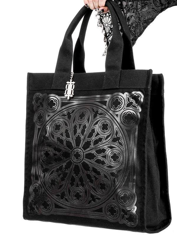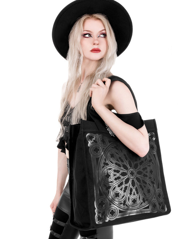Gothic tote bag crafted from 100% heavy cotton canvas. Adorned with a striking gunmetal metallic 'Rose Window' print on the front. Internal zip pocket. Padded handles for maximum comfort even when you're carrying heavier items. Fully lined with durable polyester – gothic luxury inside and out! Internal loop perfect for attaching key rings and custom charms.