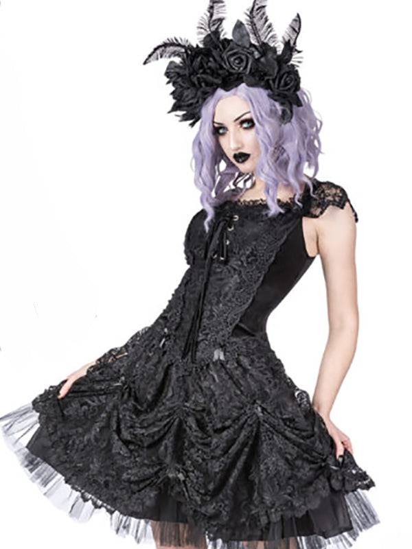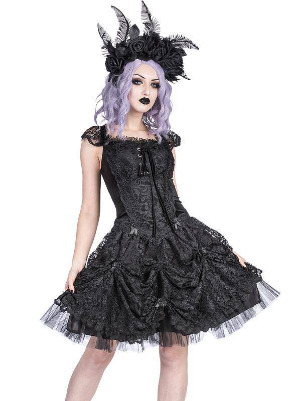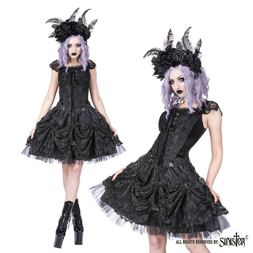 Sinister. Minidress with lace cap sleeves and diamond neckline. Both front- as back panels of the fitted bodice are covered with French lace and black satin ribbon lacing through metal eyelets is decorating the bust at the front. The soft satin underskirt has a sier of stiff tulle ruffle adorned for extra volume. Concealed zipper at the back of the dress.