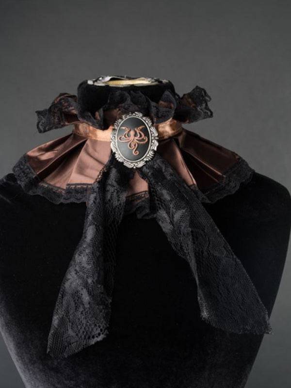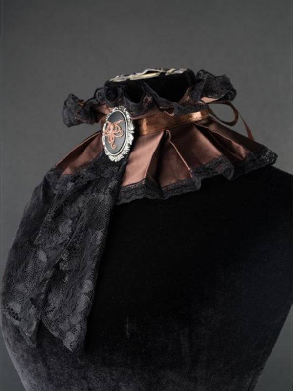 Choker adorned with soft black lace with copper-toned panels. Adjustable Fit. BROOCH NOT INCLUDED.