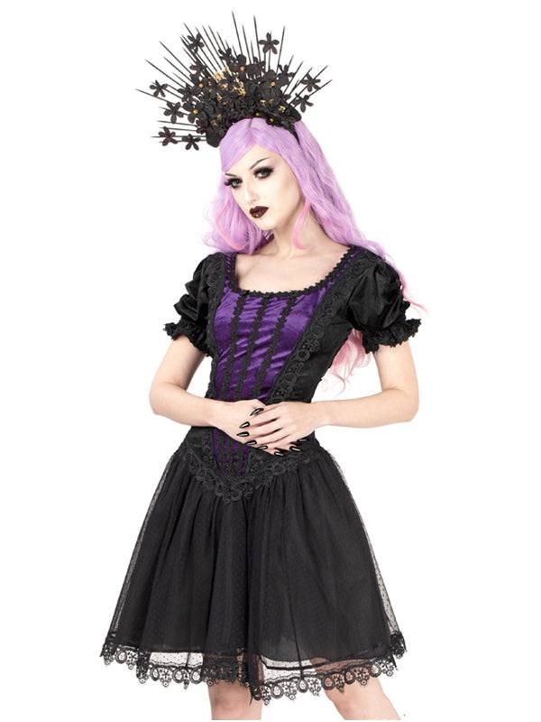 Dress with scoop neckline and elasticed puff sleeves trimmed with black Venetian lace. The fully lined skirt is made of black soft, black dotted tulle which is trimmed with Venetian lace along the hem of the skirt. The minidress has a zipper at the back.