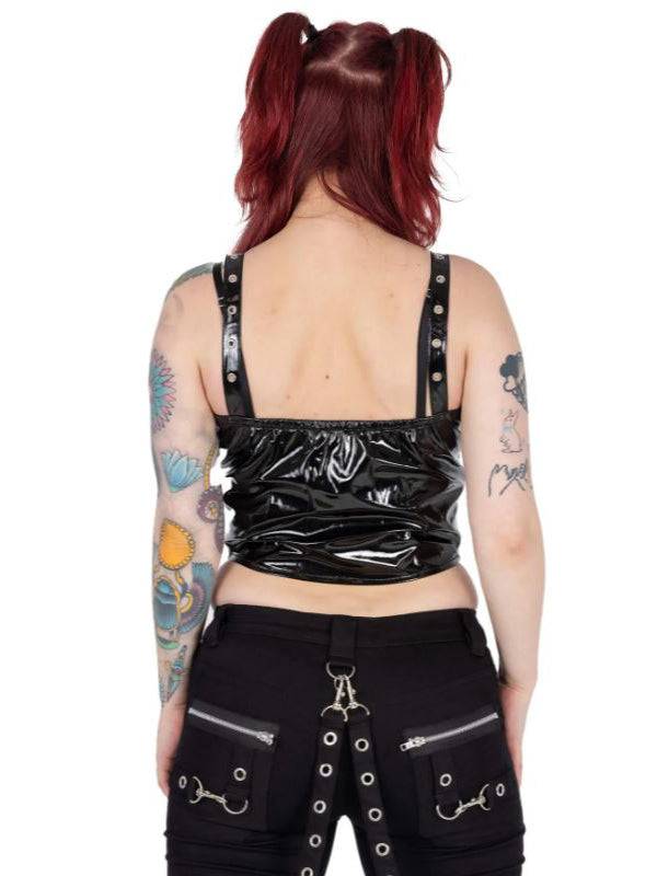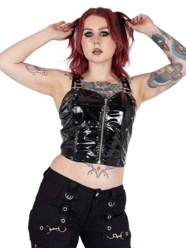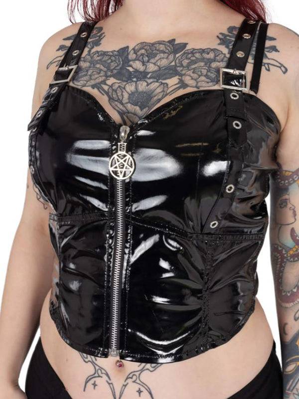 Black pvc top with wide adjustable straps, grommet trim, and metal zipper front with pentagram zipper pull. 70% PVC 30% Polyester