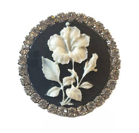 Broche noire motif fleur avec pierres brillantes.
