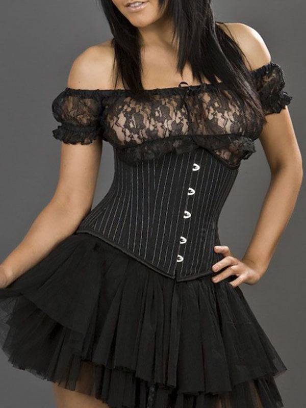 Corset en coton noir à rayures blanches. Fermoirs en métal sur le devant et laçage au dos. Baleines en acier