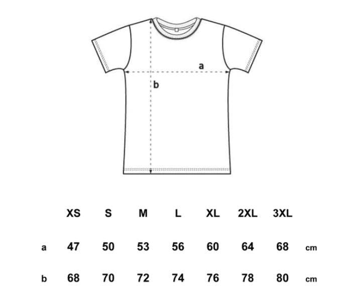Toutes les mesures sont prises avec le t-shirt à plat. Mesures en centimètres.