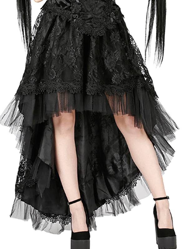 Jupe avec juxtaposition de jupons. Le 1er jupon est en satin et a de larges volants en tulle dramatique. Le jupon supèrieur est en dentelle sicilienne et garnie de dentelle vénitienne. Ceinture élastique avec fermeture éclair latérale invisible sur le côté.