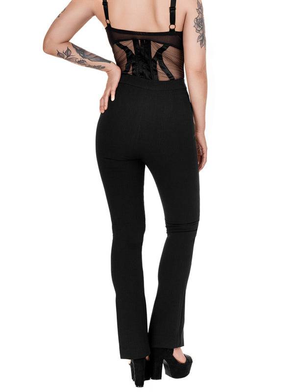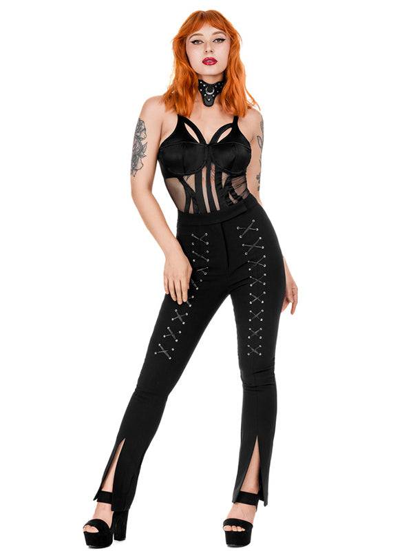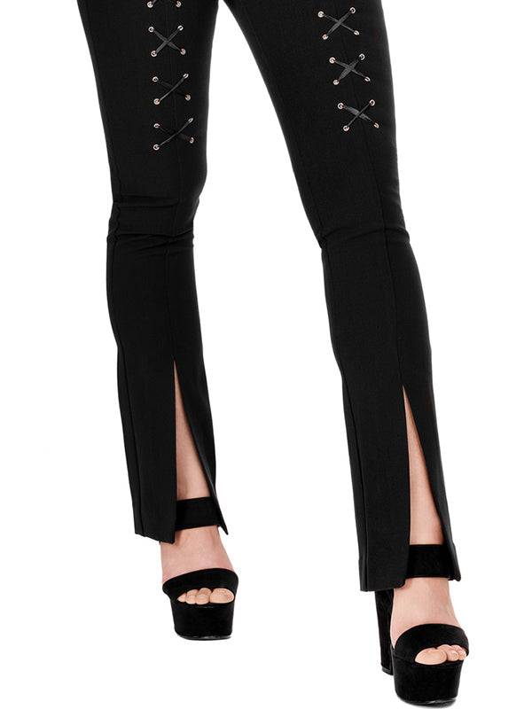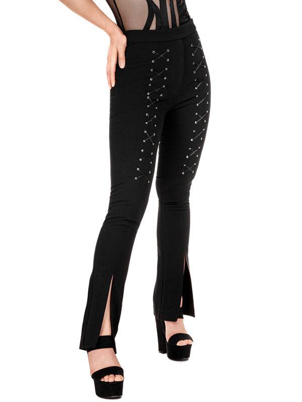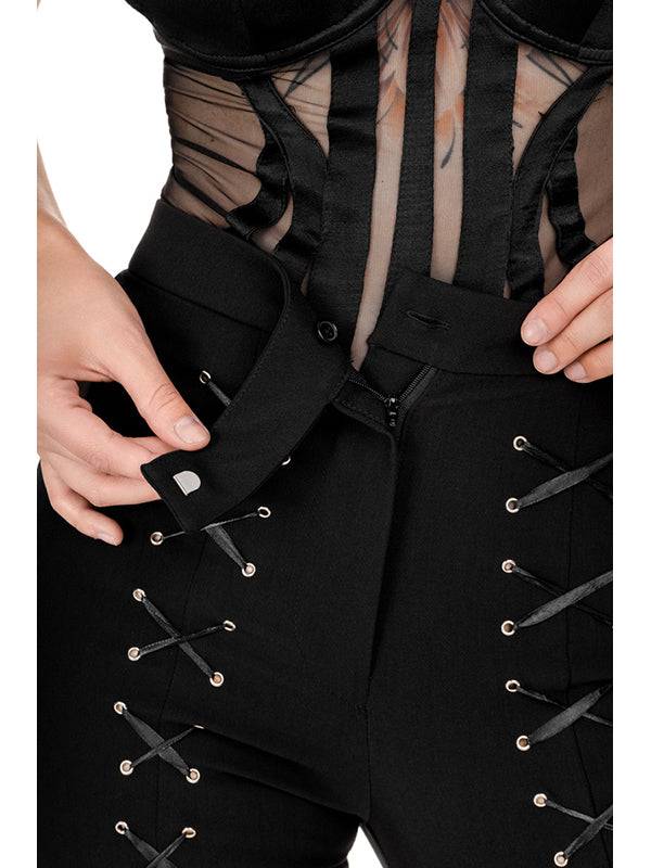 Ce pantalon a des fentes. Sur chaque jambe, vous trouverez un laçage corset décoratif. Ce pantalon est un mélange de 95% coton et 5% élasthanne et a une coupe impeccable qui épouse vos courbes. La touche d'élasthanne garantit un confort inégalé pour un port prolongé. Avec bouton et fermeture éclair sur le devant.