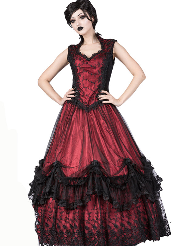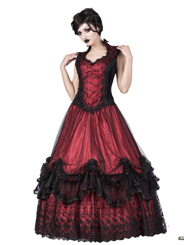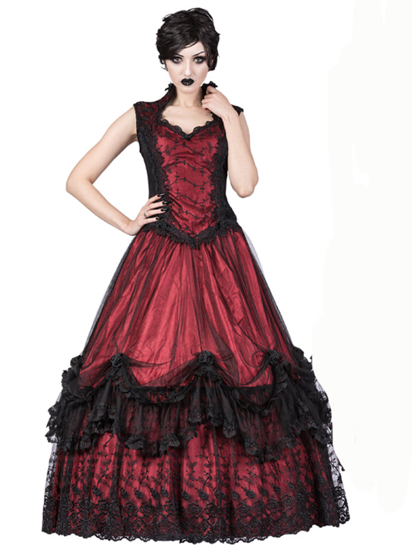 Robe de bal victorienne spectaculaire avec un subtil col vampire. Haut ajusté en velours et satin doux avec superposition de dentelle française brodée. La jupe fluide est composée de deux épaisseurs : la première en résille noire douce, froncée avec de larges roses en satin noir, est ornée d'une bordure en dentelle vénitienne. La jupe est entièrement doublée de satin doux et soyeux et possède une fermeture éclair dissimulée au milieu du dos.