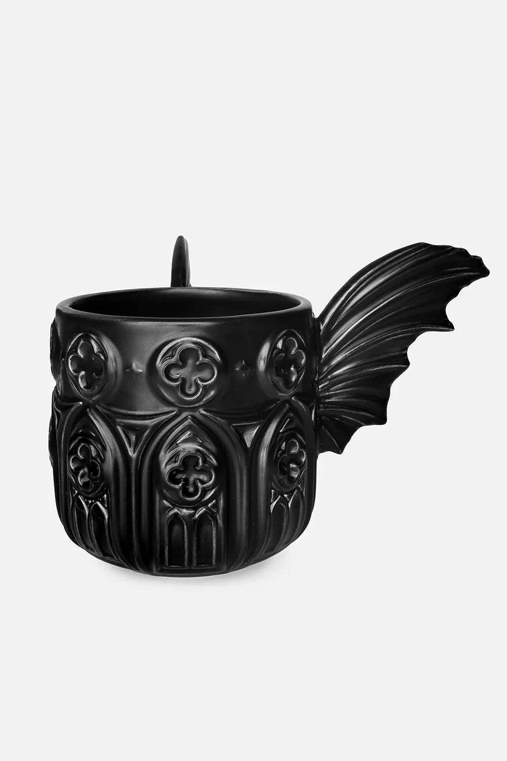 This gothic tea-cup is inspired by cathedral architecture and winged creatures of the dark. Its dramatic 3D bat wing handles and cathedral tracery motifs make it a show-stopping piece of gothic homeware. Perfect bat cup for witches’ brews, midnight tea rituals, or as a centerpiece in your magical kitchen.