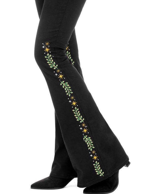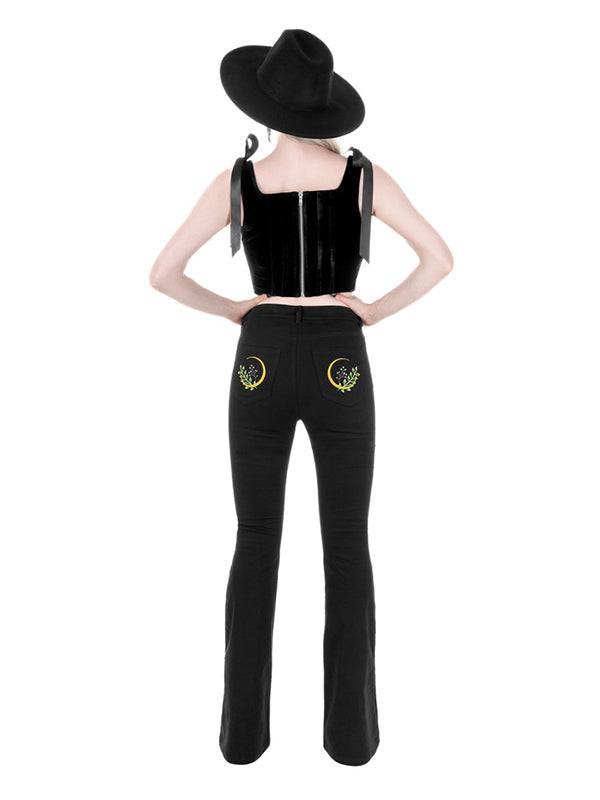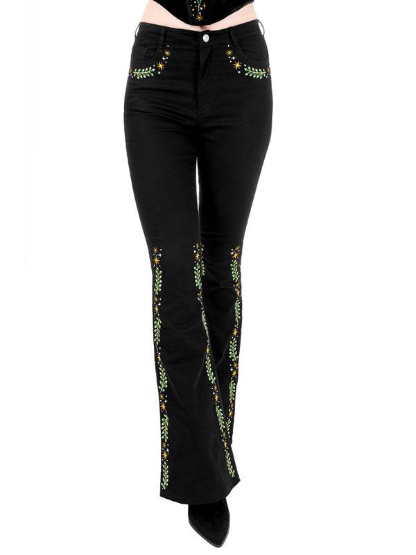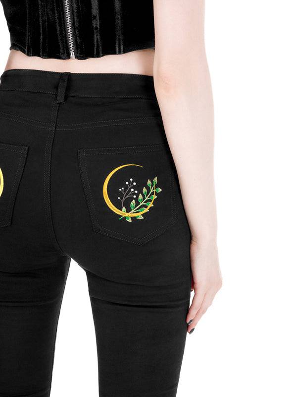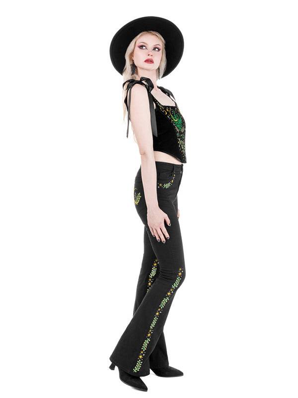 Pantalon taille haute pour un look élégant. Bas évasé d'inspiration vintage. Ajusté à la taille et aux cuisses, évasé à partir du genou pour une silhouette élégante. Broderie complexe de lune et d'herbes sur le bas des jambes, les ouvertures des poches avant et les poches arrières. Fermeture boutonnée et zippée sur le devant pour un ajustement sûr et élégant.